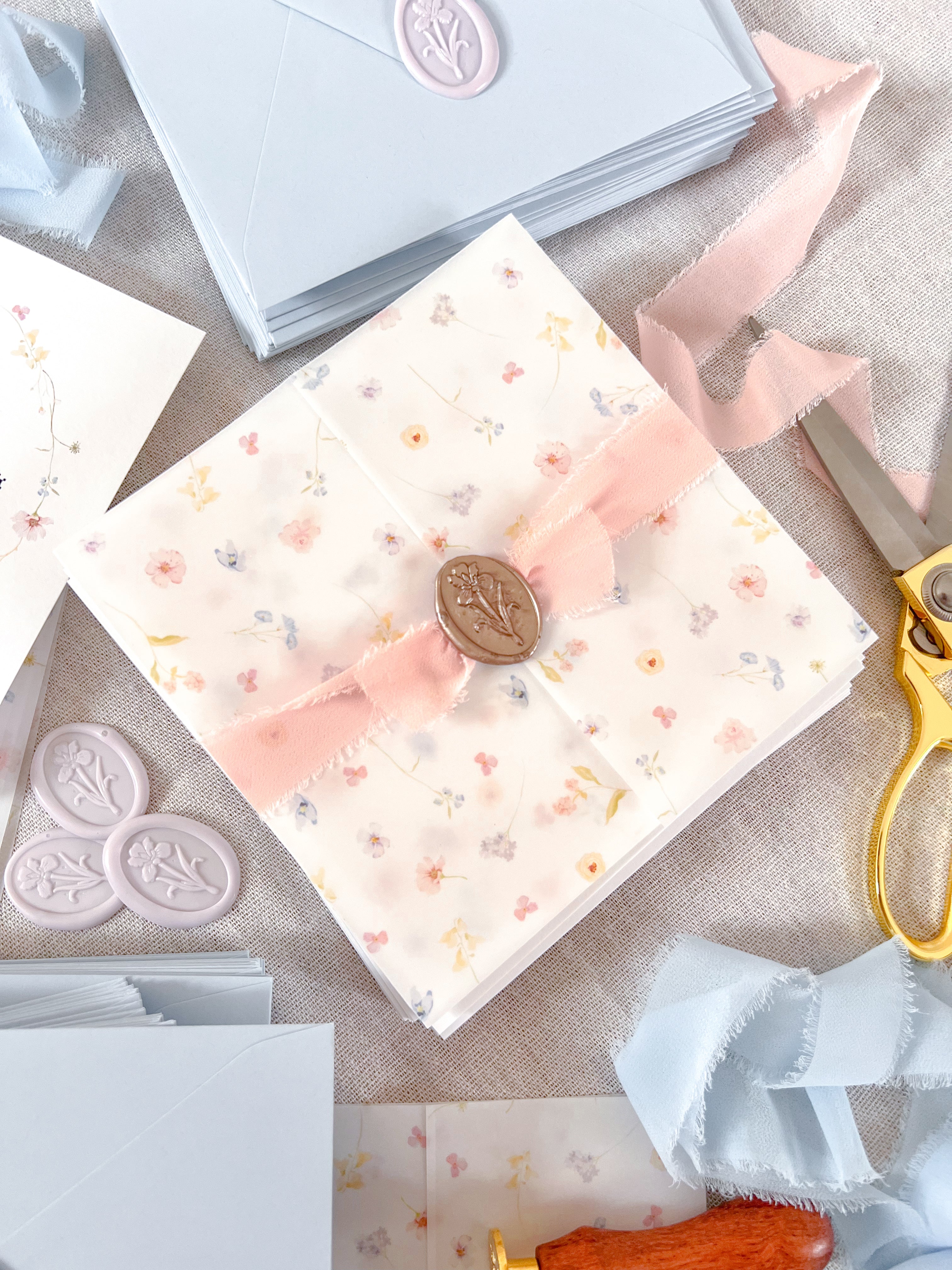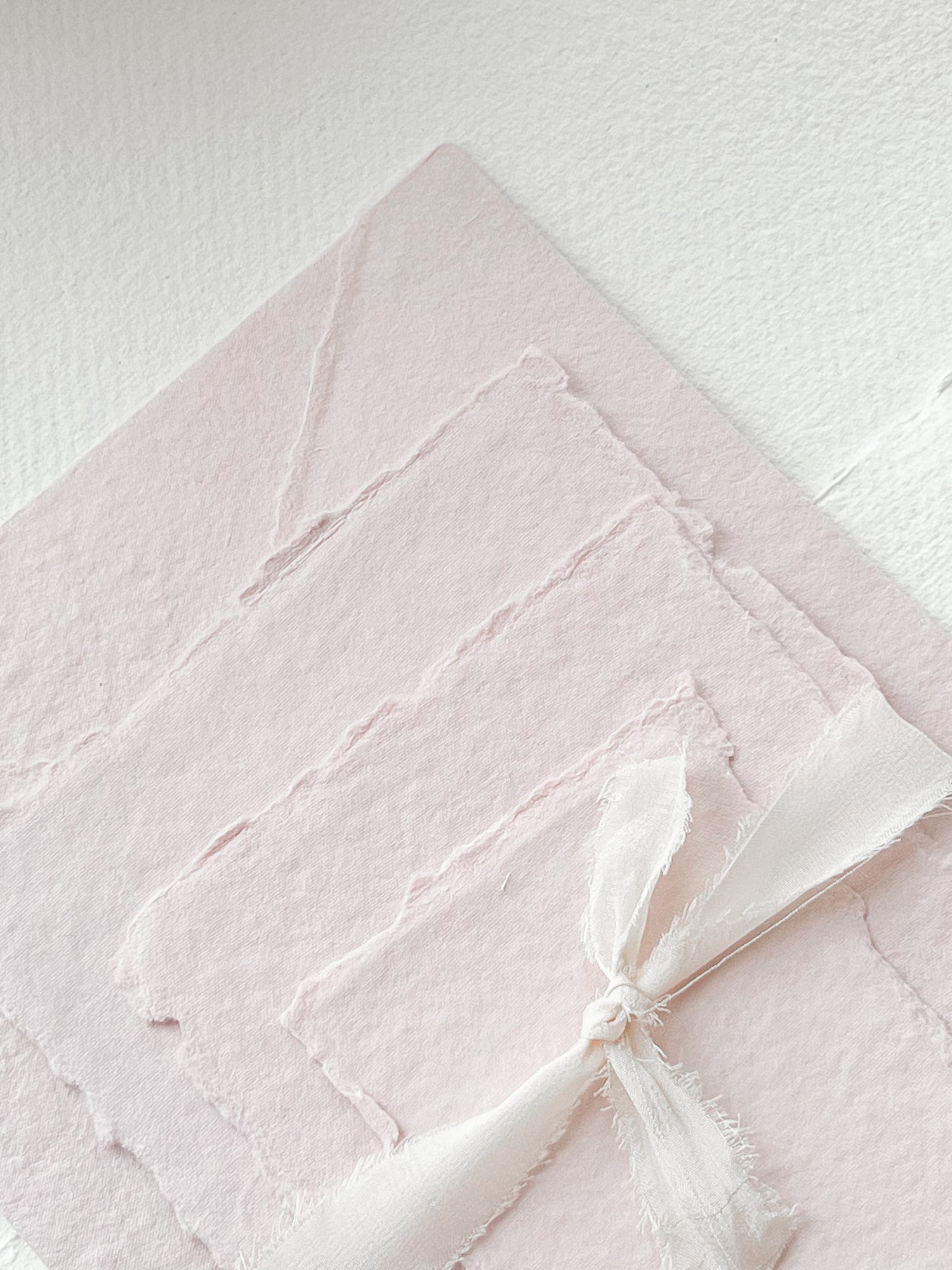Each piece is lovingly handmade in our Hampshire studio, using carefully sourced materials that reflect the beauty and quality we are known for. From hand-torn deckled edges to silk ribbon bows and wax seals, we believe it’s these delicate details that make our designs so special. We use handmade cotton paper to give our pieces a soft, textured feel, and our envelope liners are individually cut and placed to ensure perfection in every fold. We also strive to source our materials locally where possible, supporting small businesses and ensuring that each element of your stationery is crafted with care. Our goal is to create beautiful, heirloom-quality pieces that you will treasure for years to come.