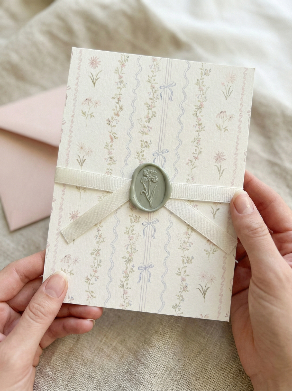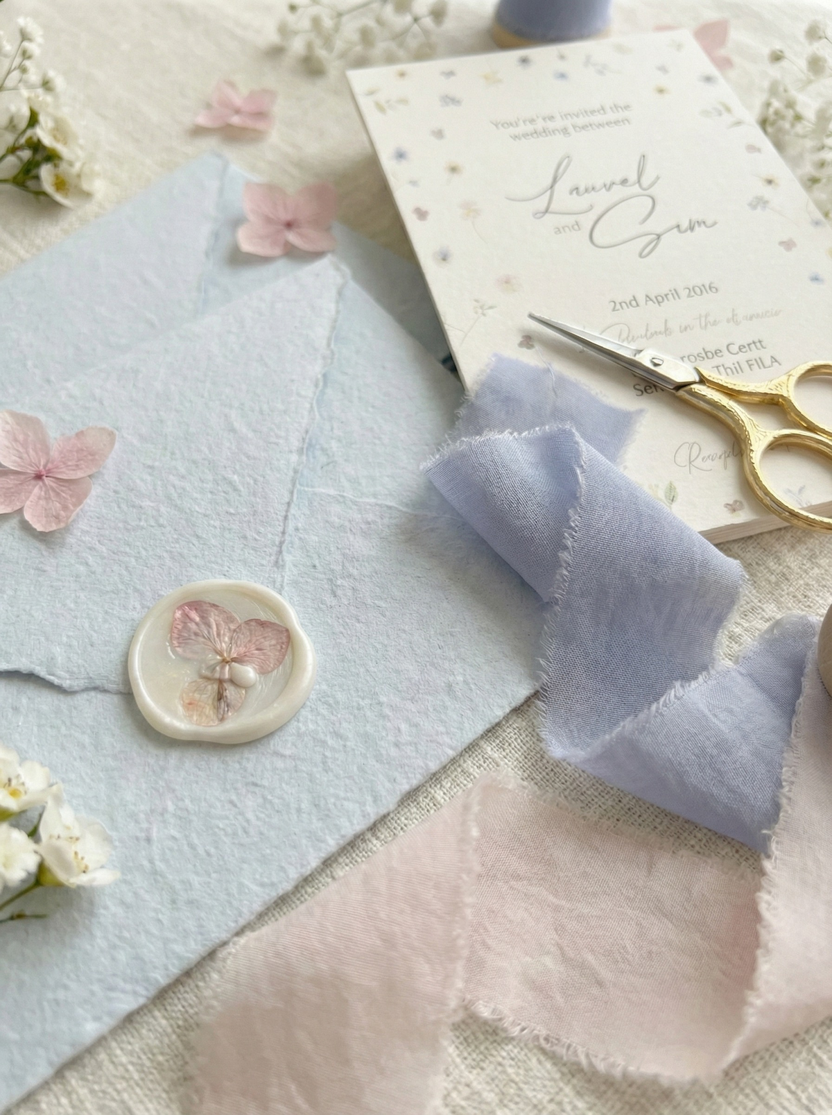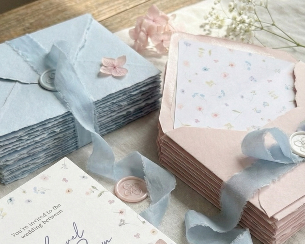 These aren't just any prints. Our watercolour flowers are inspired by real blooms, giving each invitation that authentic, hand-painted look, perfect for couples who adore a pastel wedding theme. We print them onto gorgeous, uncoated paper with deckle edges and pair them with our favourite mixture of light blue and blush pink envelopes, complete with charming wax seals. The colours, a dreamy blend of soft pinks, lilacs, and gentle blues, create the perfect first peek at your beautiful day.
