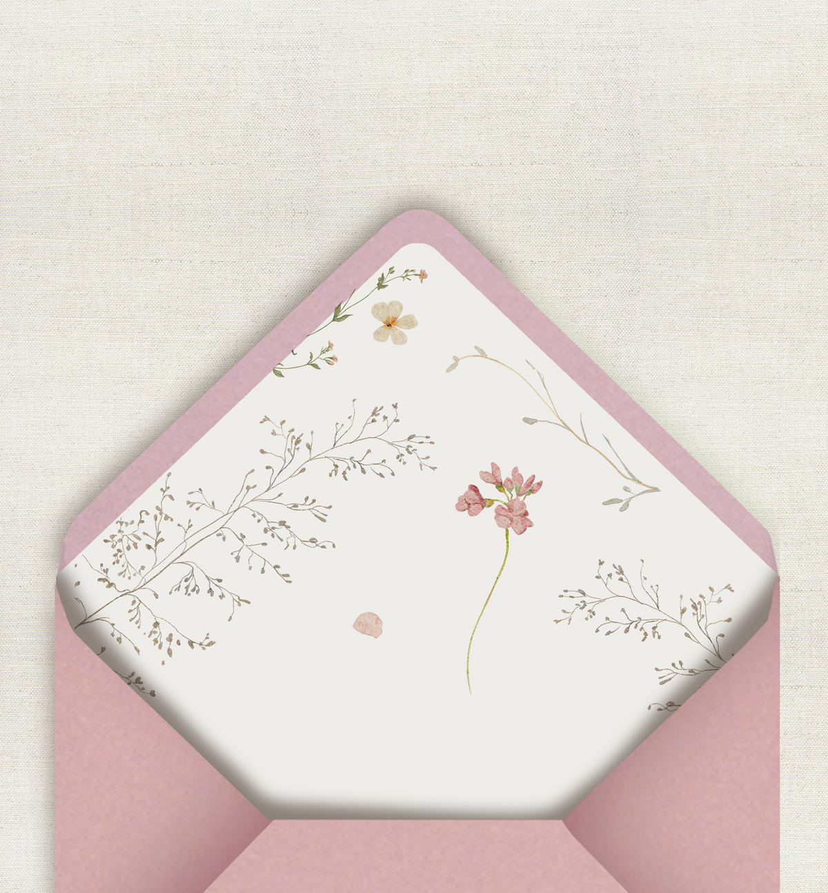 These aren't just any prints. Our watercolour flowers are inspired by real blooms, giving each invitation that authentic, hand-painted look for couples that adore for a rustic wedding theme. We print them onto gorgeous, uncoated paper and pair them with our favourite mixture of dusty rose and pink envelopes. The colours, a dreamy blend of soft pinks and deep mauves, create the perfect first peek at your beautiful day.