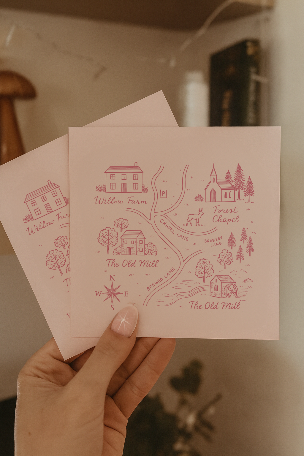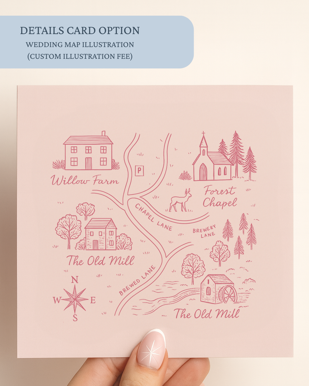 Enhance your wedding stationery with a Custom Map Illustration add-on, designed to highlight your special location with artistic detail. This service provides a personalized map that adds a unique and elegant touch, helping guests easily navigate to your venue while complementing your overall design. Perfect for creating memorable keepsakes from your wedding day.