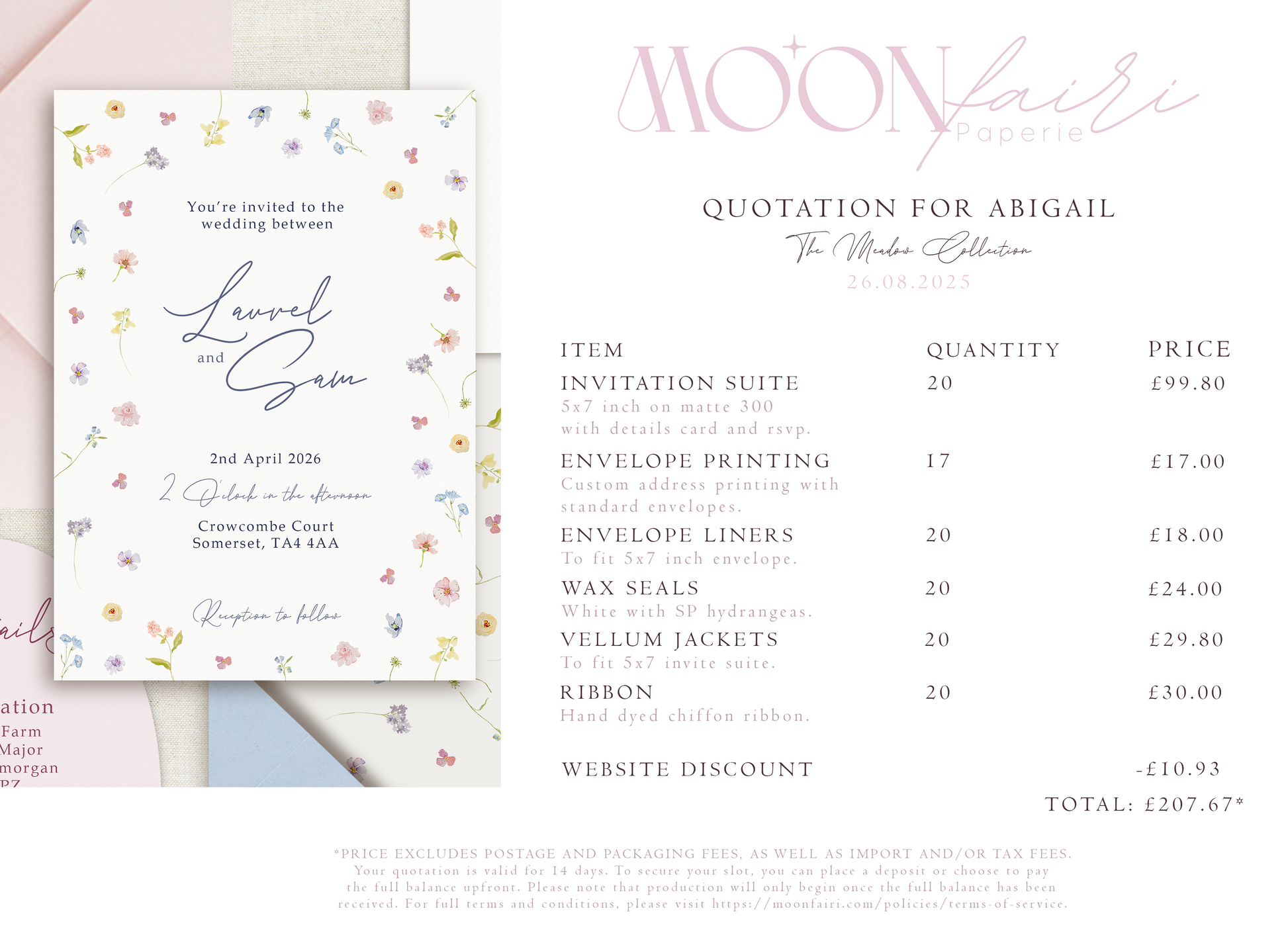 - 20x Invitation suites with 5x7 inch invite, details card and rsvp card