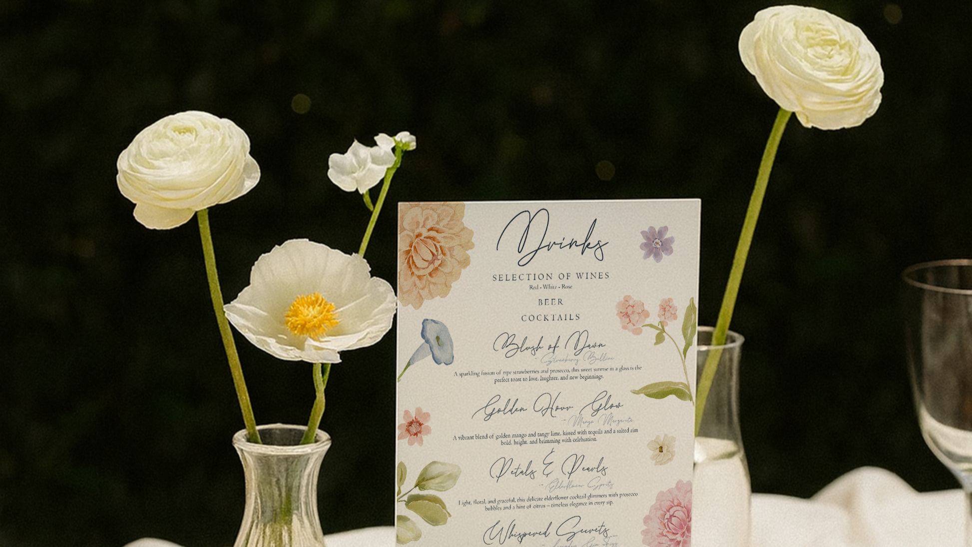 Styled with elegant script and floral details, these menus look stunning laid on plates, tucked into napkins or framed by fresh flowers and candles. Perfect for garden weddings, cottage core receptions and spring or summer fine art weddings, they tie your table décor together beautifully.