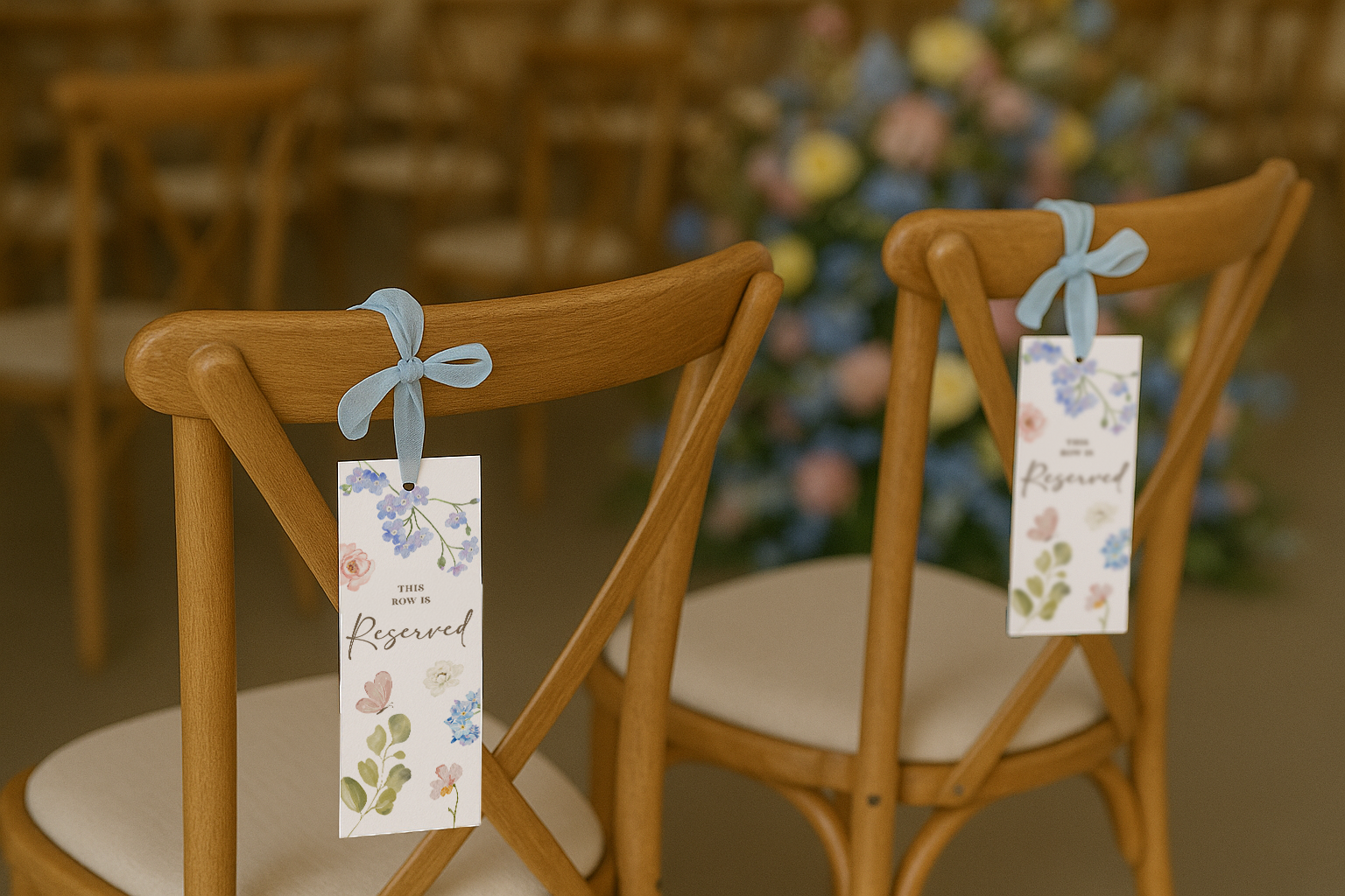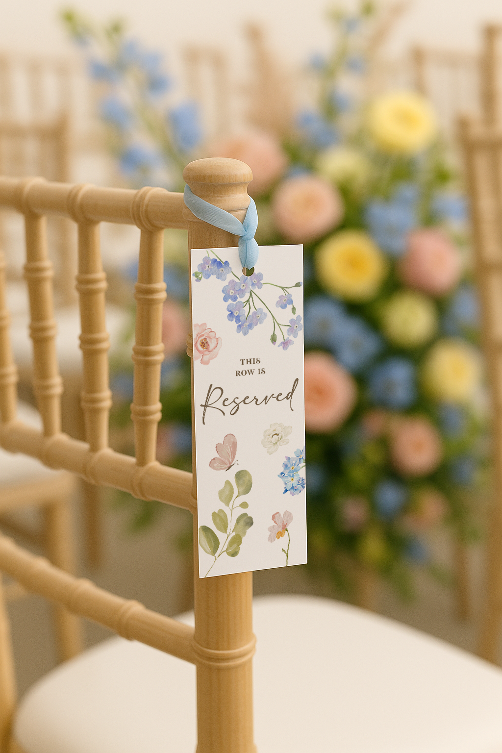 Emma Reserved Seat Tags offer a sophisticated seating solution for your wedding ceremony. Meticulously crafted on premium linen cardstock, these rectangular tags feature elegant blue chiffon ribbon attachments designed specifically for wedding aisle chairs. The ribbon colour can be customized to complement your event's colour scheme, ensuring seamless integration with your wedding aesthetic.