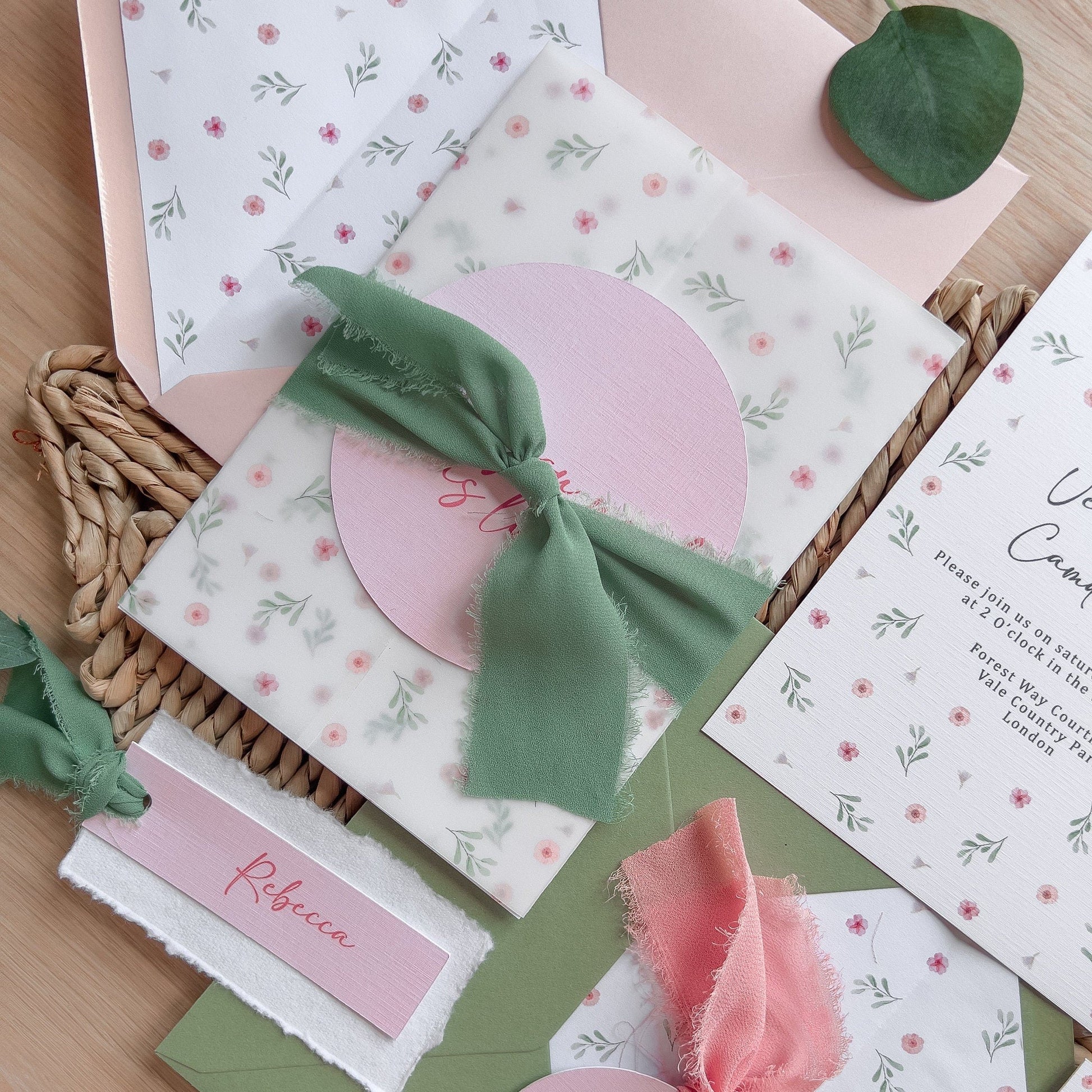 🌸 The Camden Suite showcases tiny pink flowers with sage green leaves in a seamless pattern, adorning the invitation, menu card, vellum jacket, and envelope liner. The main invitation is elegantly wrapped in a 160gsm vellum jacket, sealed with either a wax seal or a matching ribbon for a personalized touch.