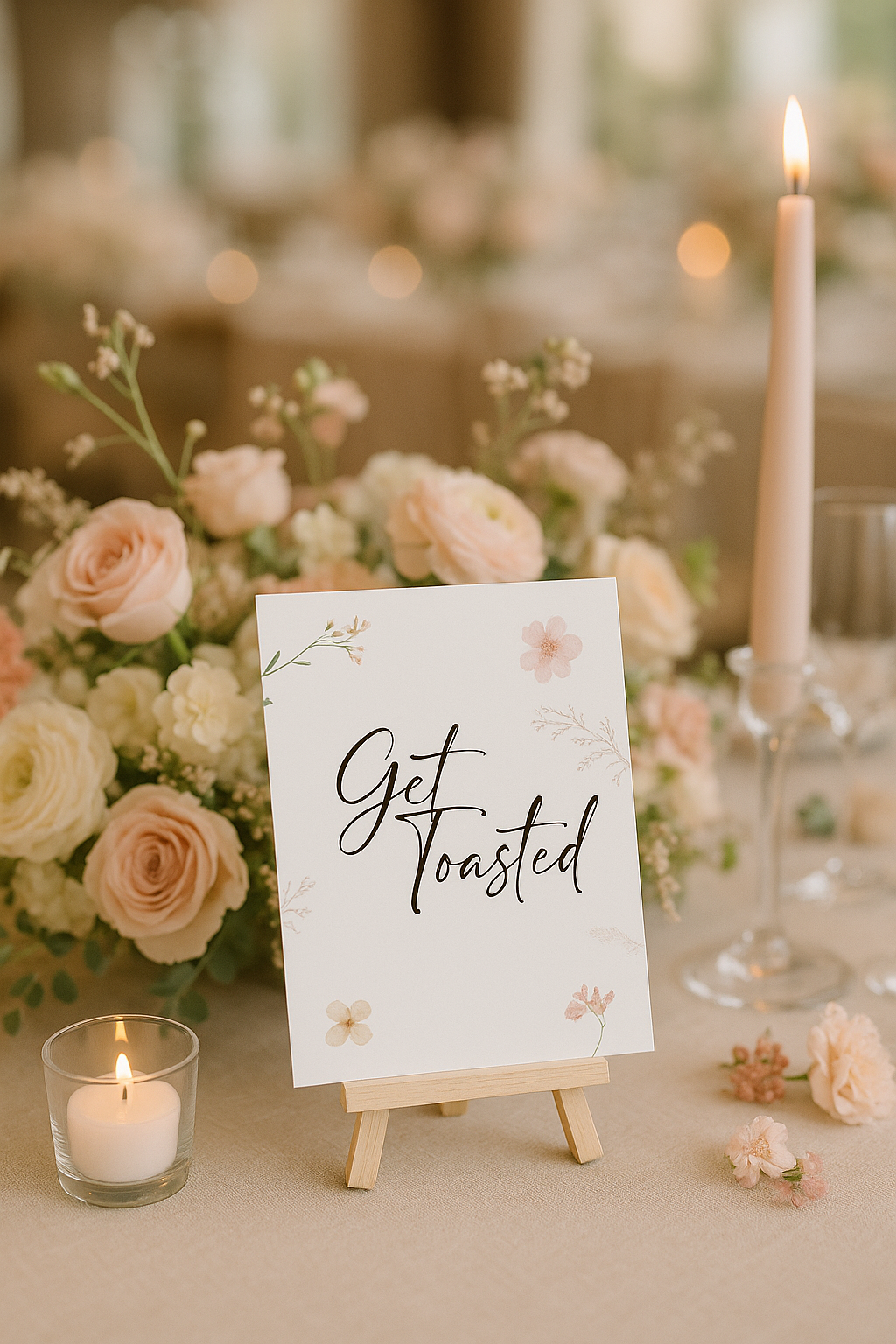 Elegant wedding sign featuring the phrase 'Get toasted' adorned with delicate soft pink, blush, and nude florals. Available in multiple sizes (A4, A5, A6) with an optional deckled edge finish for a handcrafted touch. Perfect for s'mores stations or toast bars at your special celebration.