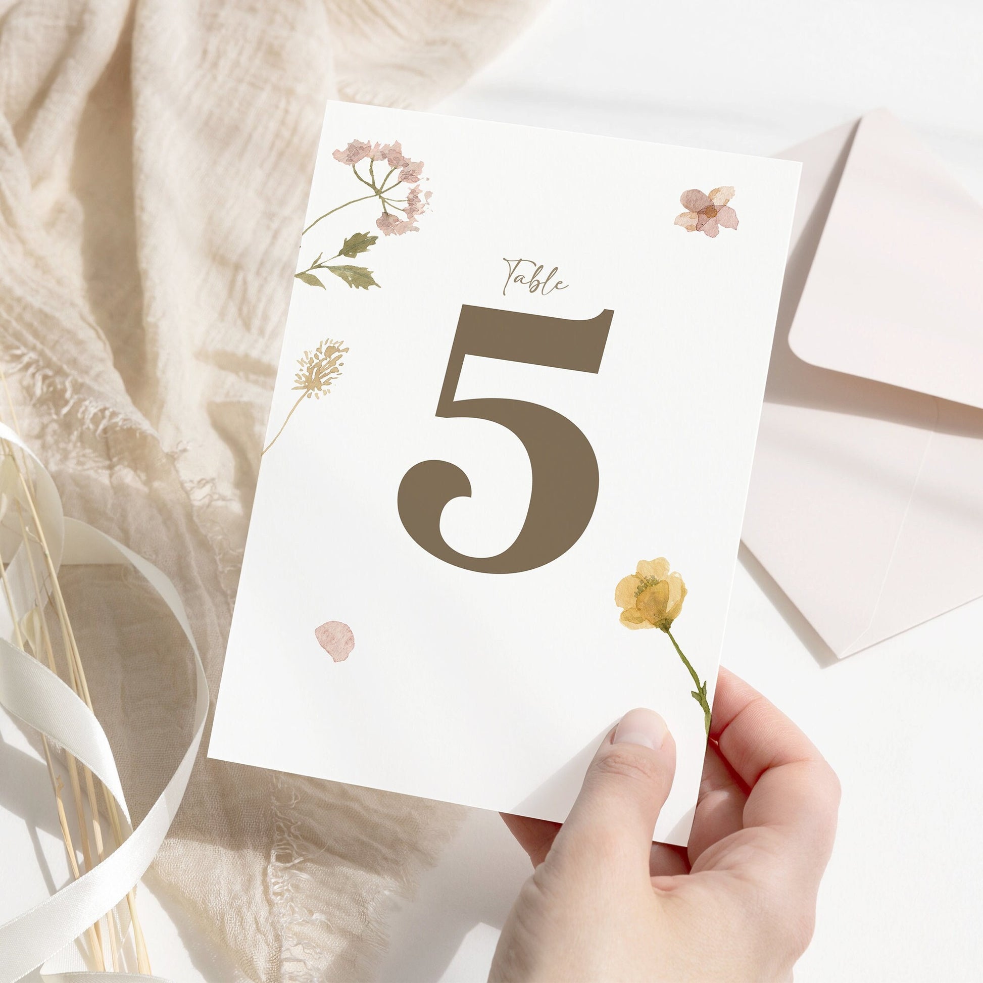 Wildflower wedding table numbers are perfect for your special occasion. Made of 260gsm Hammered Card, each table number is elegantly illustrated with a watercolour flower, making it an eye-catching addition to any table setting.