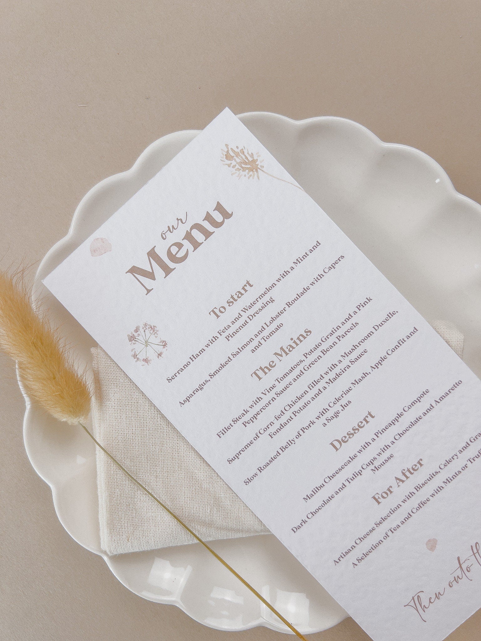 This exquisite Wildflower wedding menu is printed on 260gsm hammered card stock, finished with tasteful dried floral illustrations. Perfect for an elegant and classic wedding, this luxurious menu will provide an unforgettable touch of refined luxury to your special day. Choose between a textured deckled edge finish, or a refined clean cut edge.