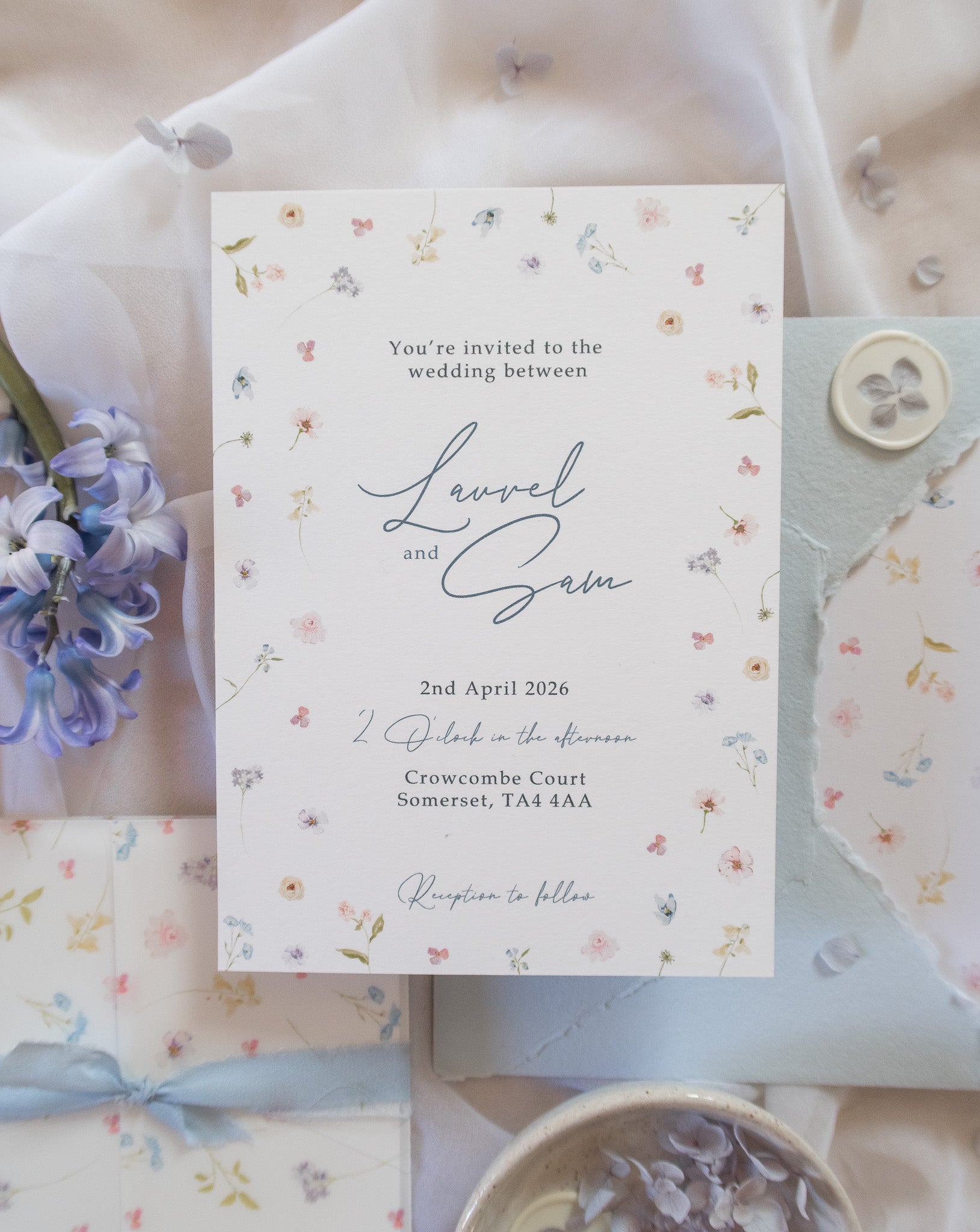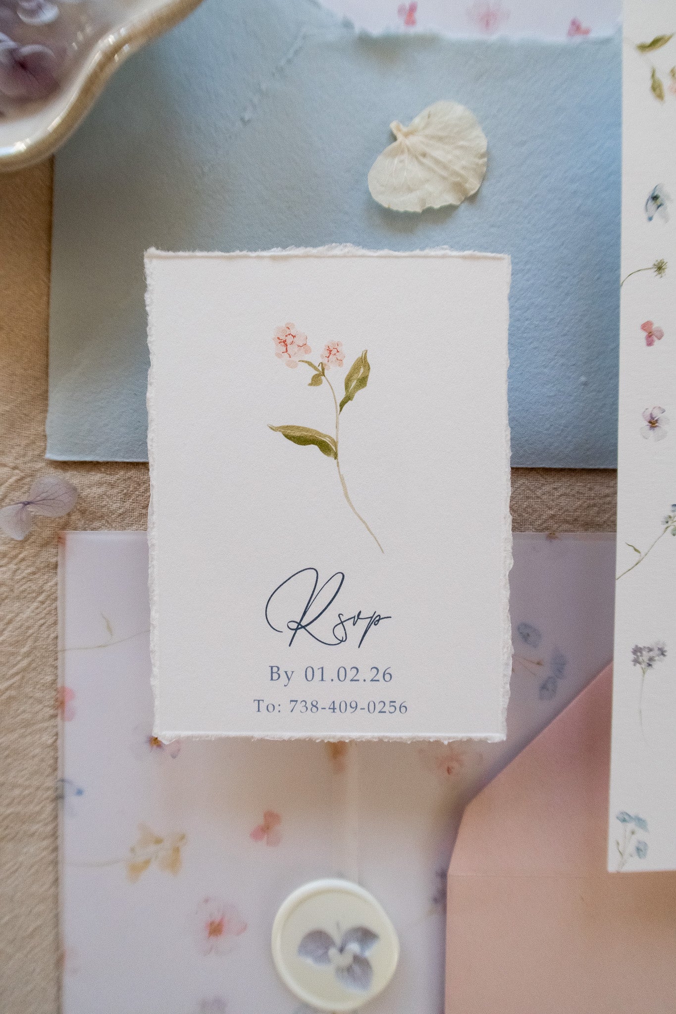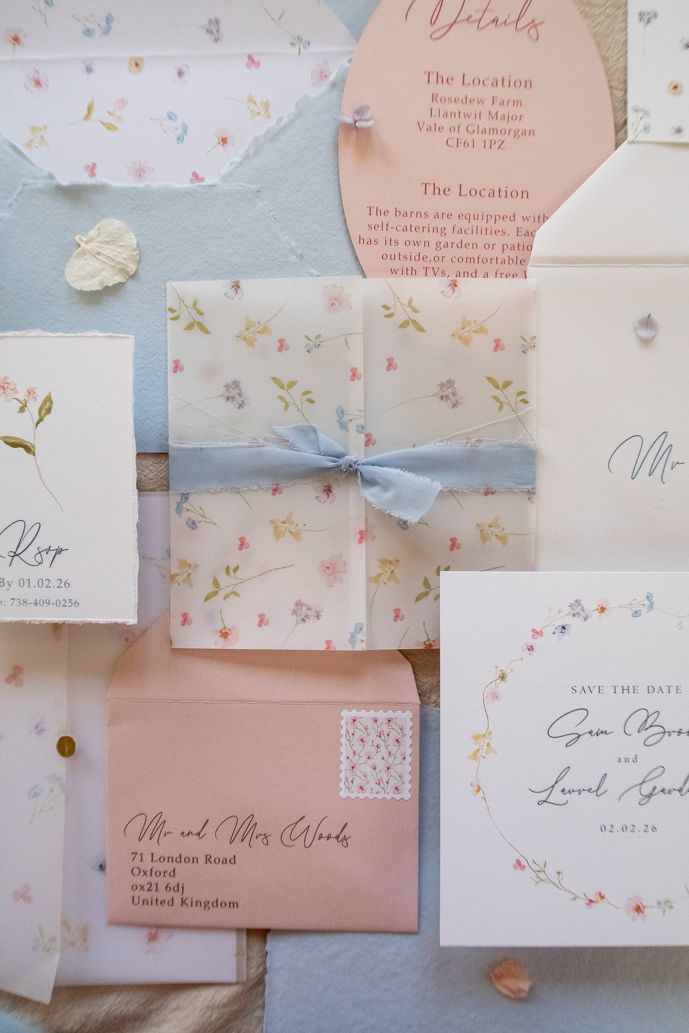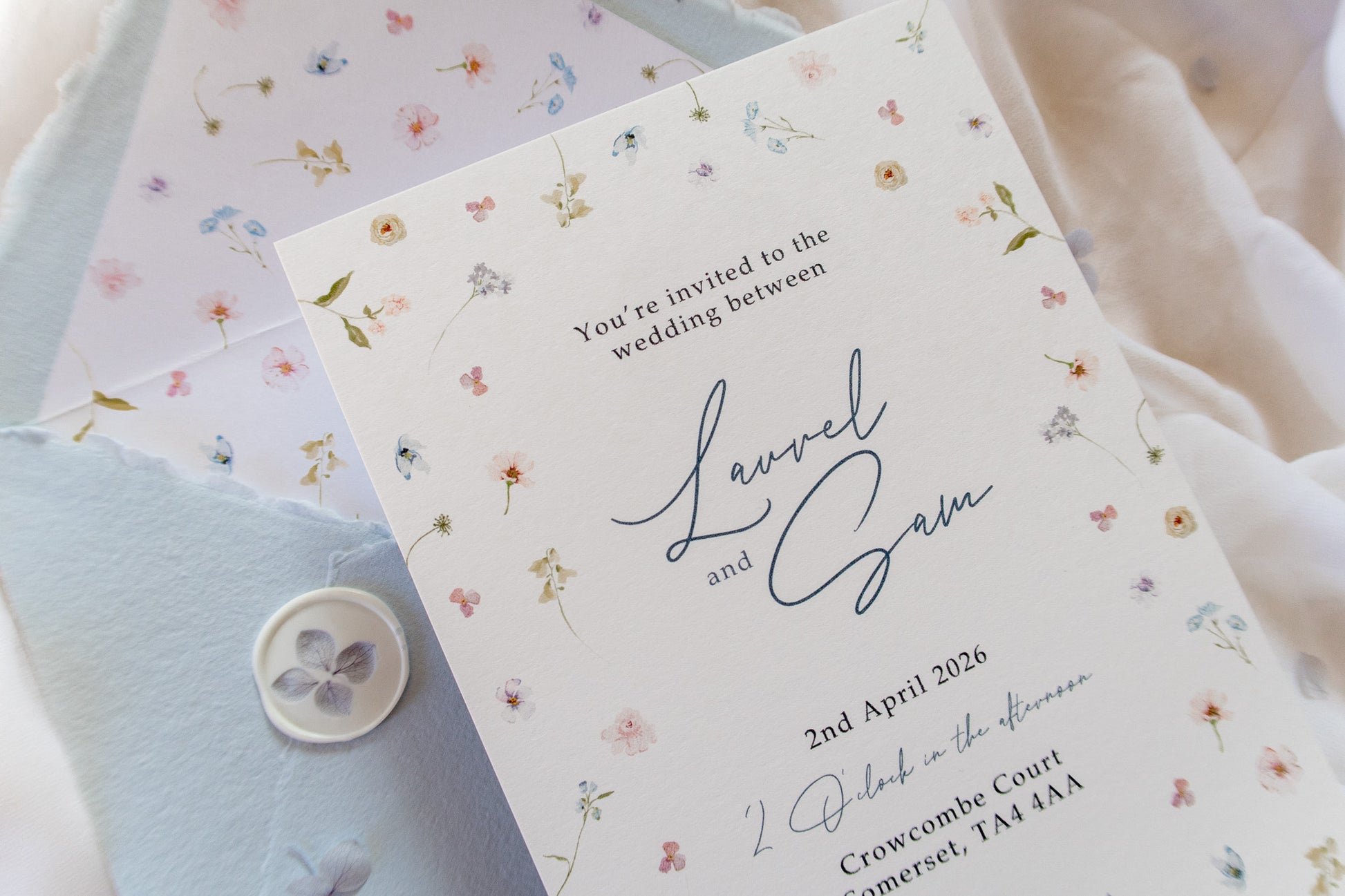 Introducing the ‘Meadow’ wedding invitation, perfect for couples seeking a romantic, pastel wildflower vibe. Featuring delicate pastel pink and blue wildflowers dancing across soft, high-quality paper, this design captures the essence of a dreamy garden celebration. Each invitation can be paired with a handmade cotton paper envelope with deckled edges and a matching floral liner for an elegant touch.