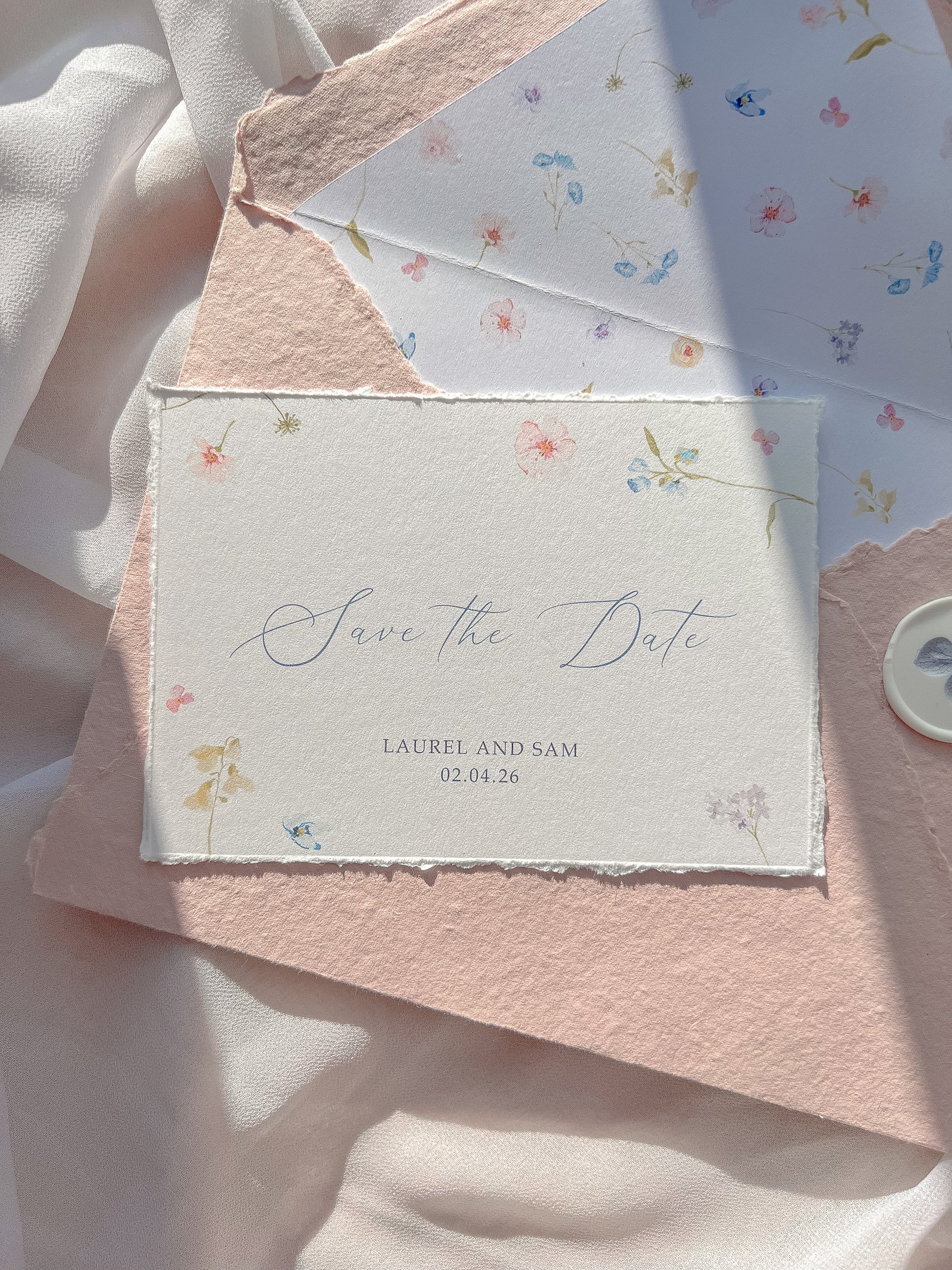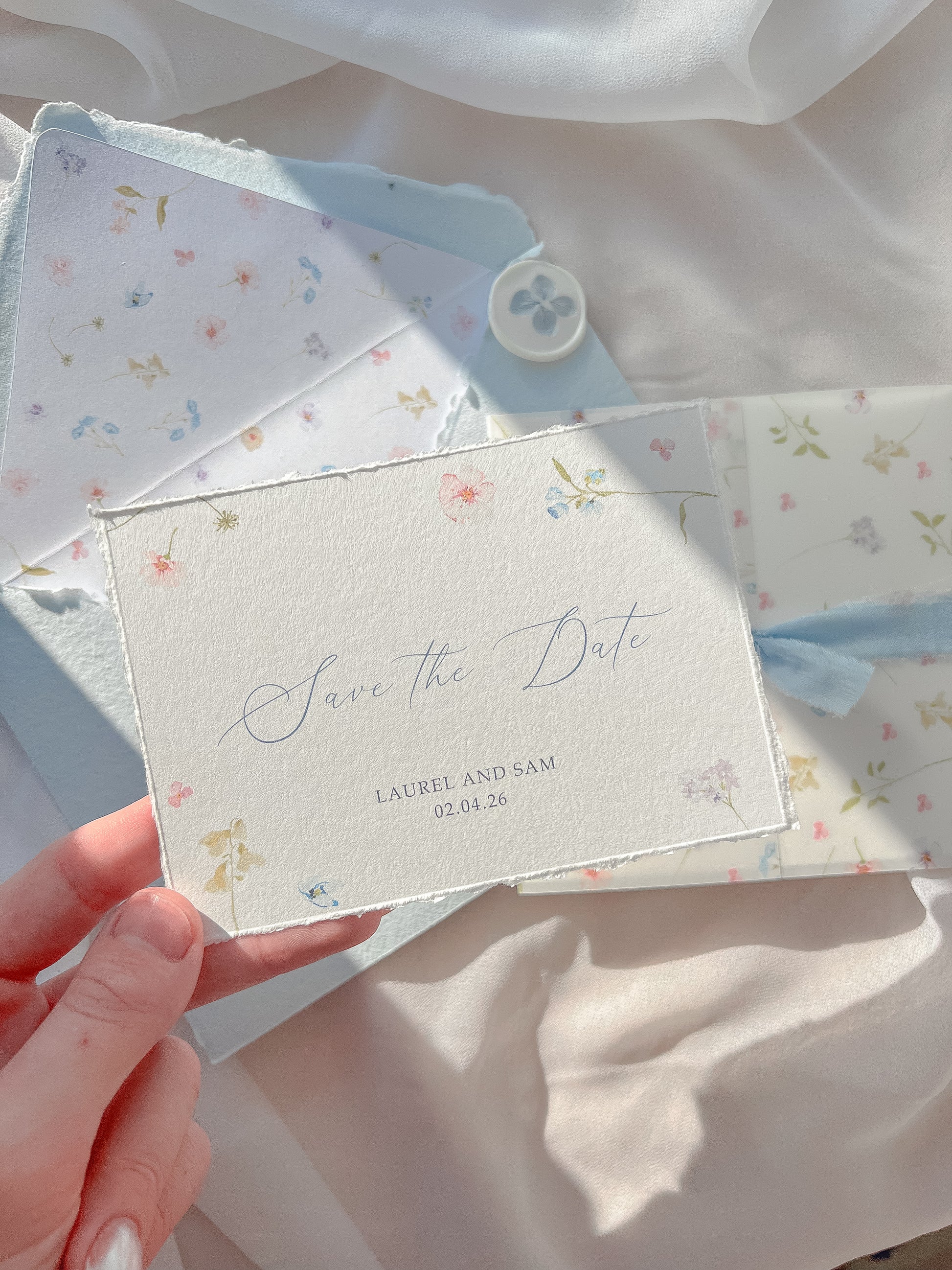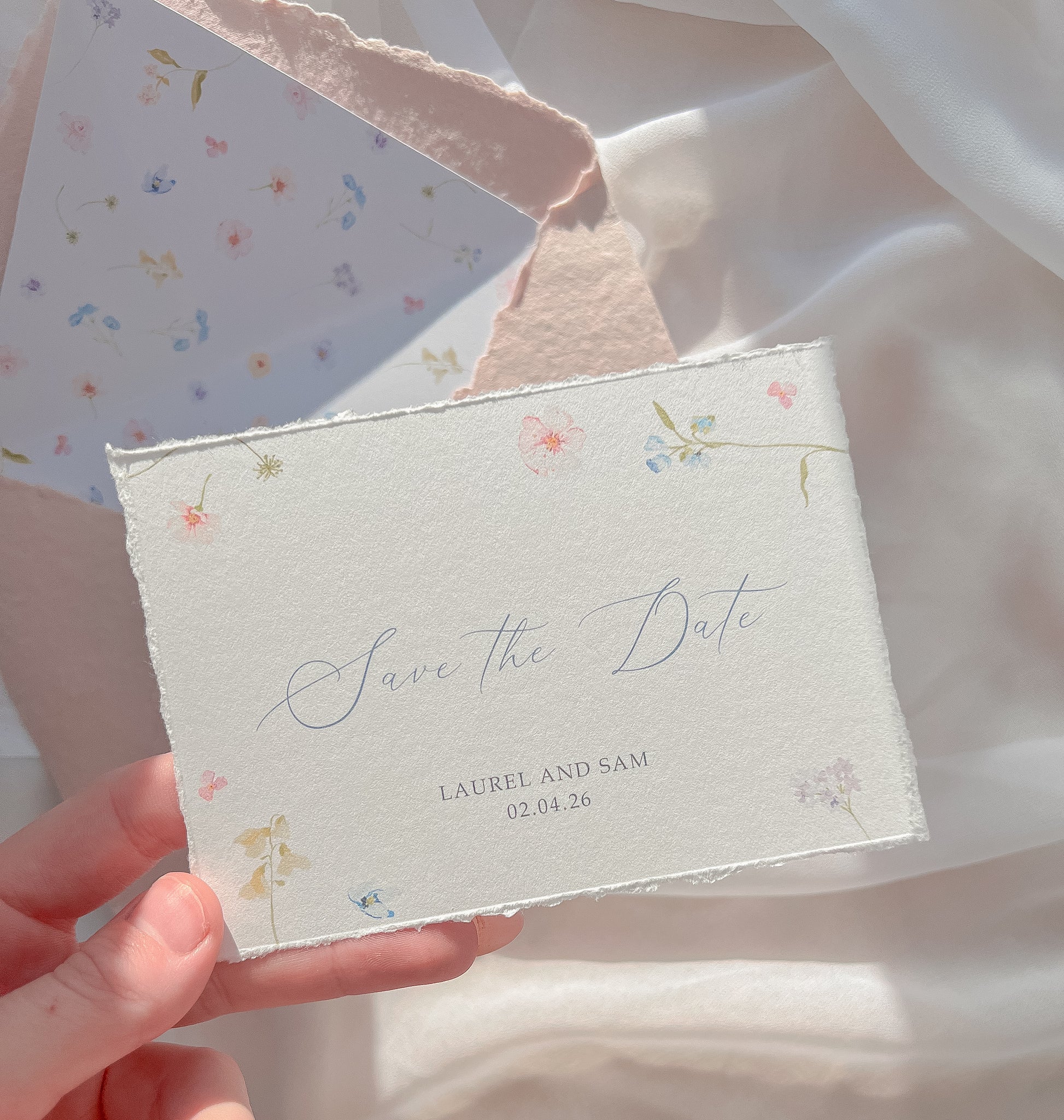 Interested in ordering your wedding invitations? Send us a message to enquire about customising the 'Meadow' suite to perfectly match your special day. Want to see and feel the quality before committing? Order a sample pack to experience the delicate details up close!