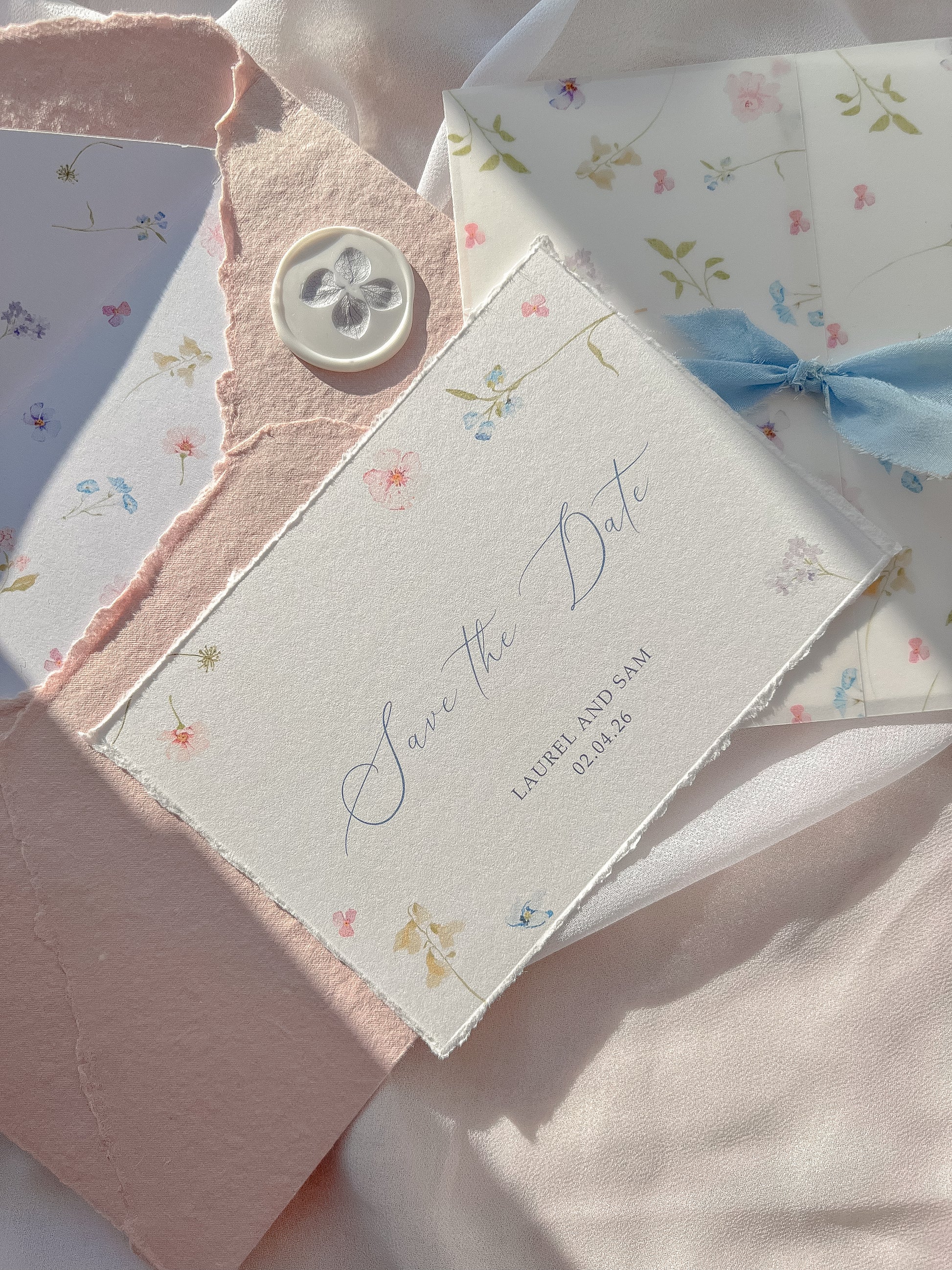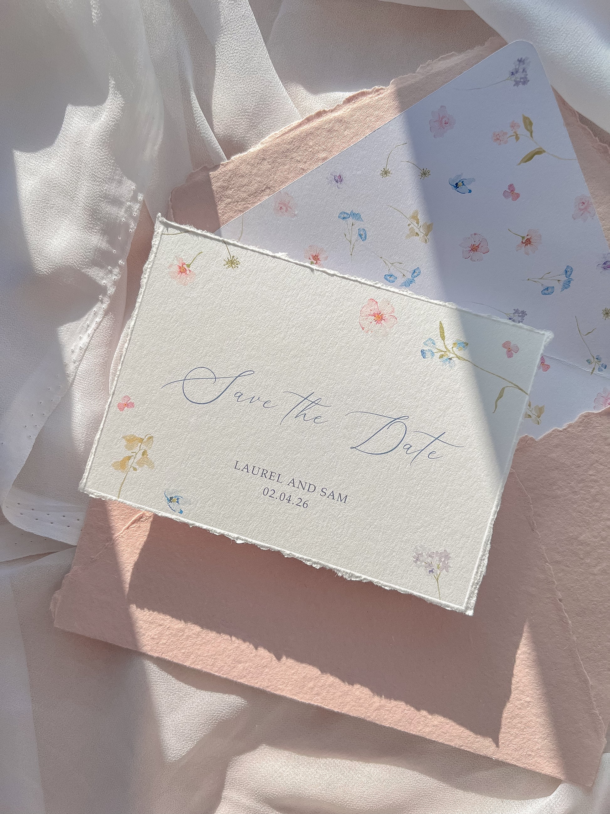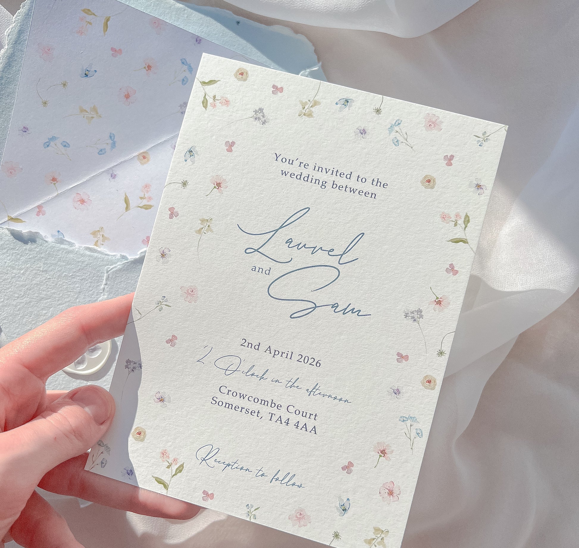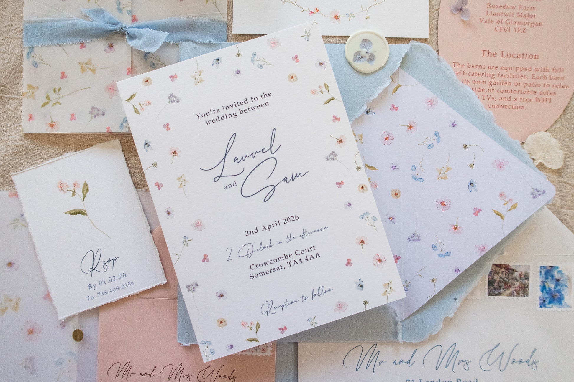 Our Laurel Pastel Wildflower collection is a delicate and romantic wedding stationery suite, designed to bring soft pastel tones and elegant floral details to your special day. Perfect for spring and summer weddings, this beautifully curated sample pack allows you to experience the full charm of our designs in person.