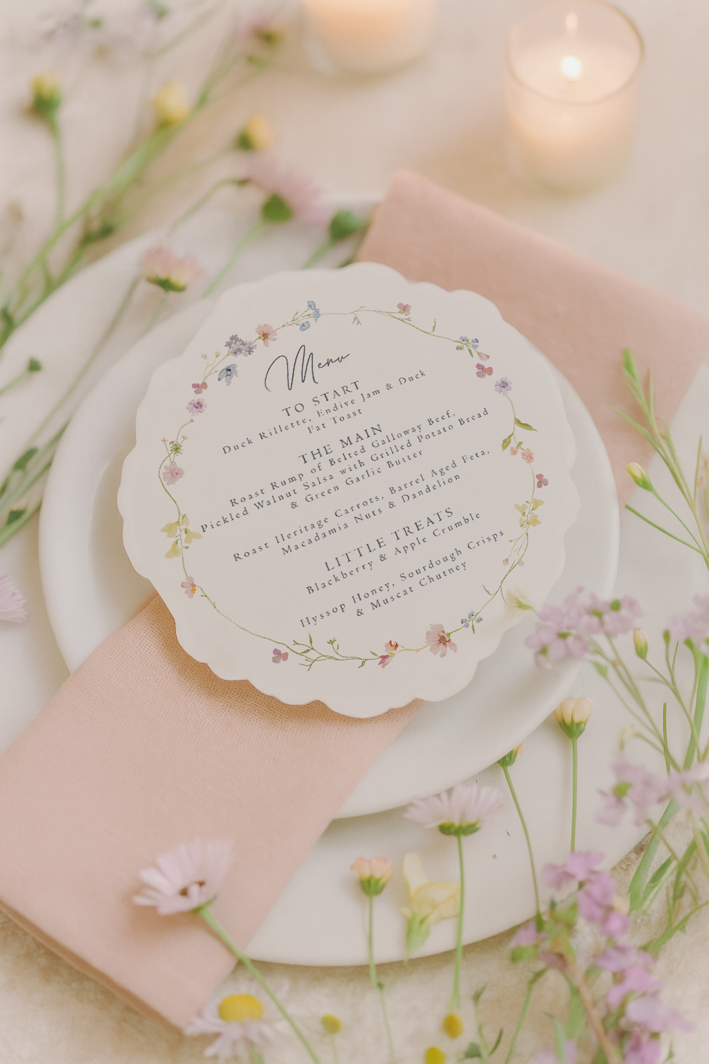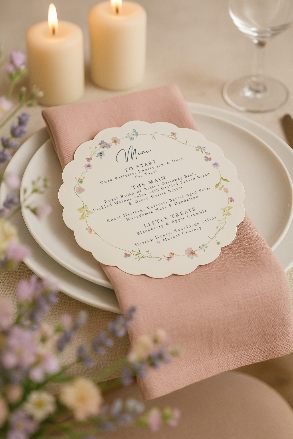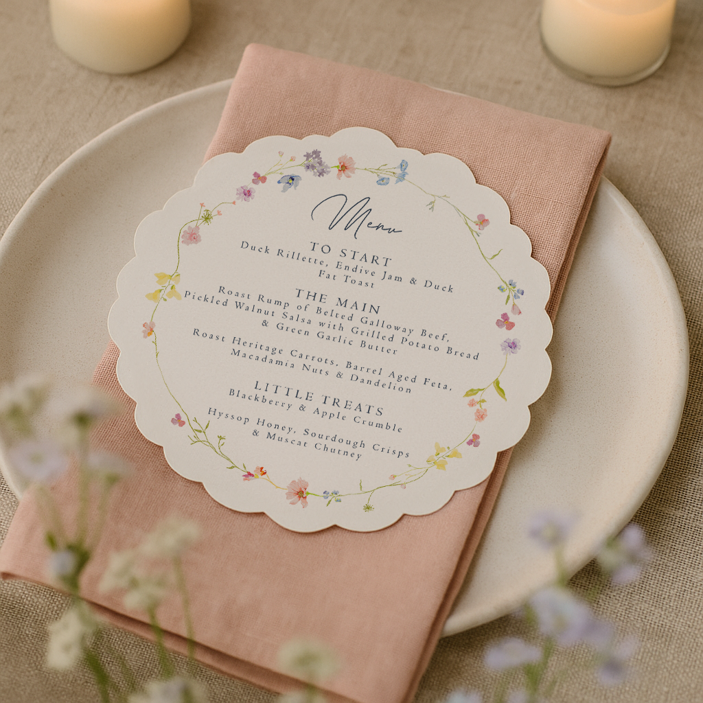 Add a romantic fine art touch with this pastel watercolour die cut wedding menu — a unique scalloped wreath design perfect for garden weddings.