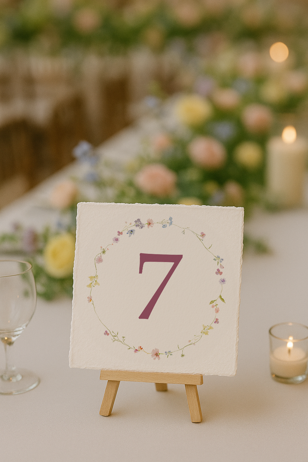 Designed in a square format, these table numbers are adorned with a pastel wildflower wreath in soft shades of blush, peach, lilac, and blue – inspired by blooming English meadows. Whether you’re planning a whimsical outdoor wedding, an elegant wildflower-themed celebration, or a romantic spring garden party, these table numbers will complement your tablescape beautifully.