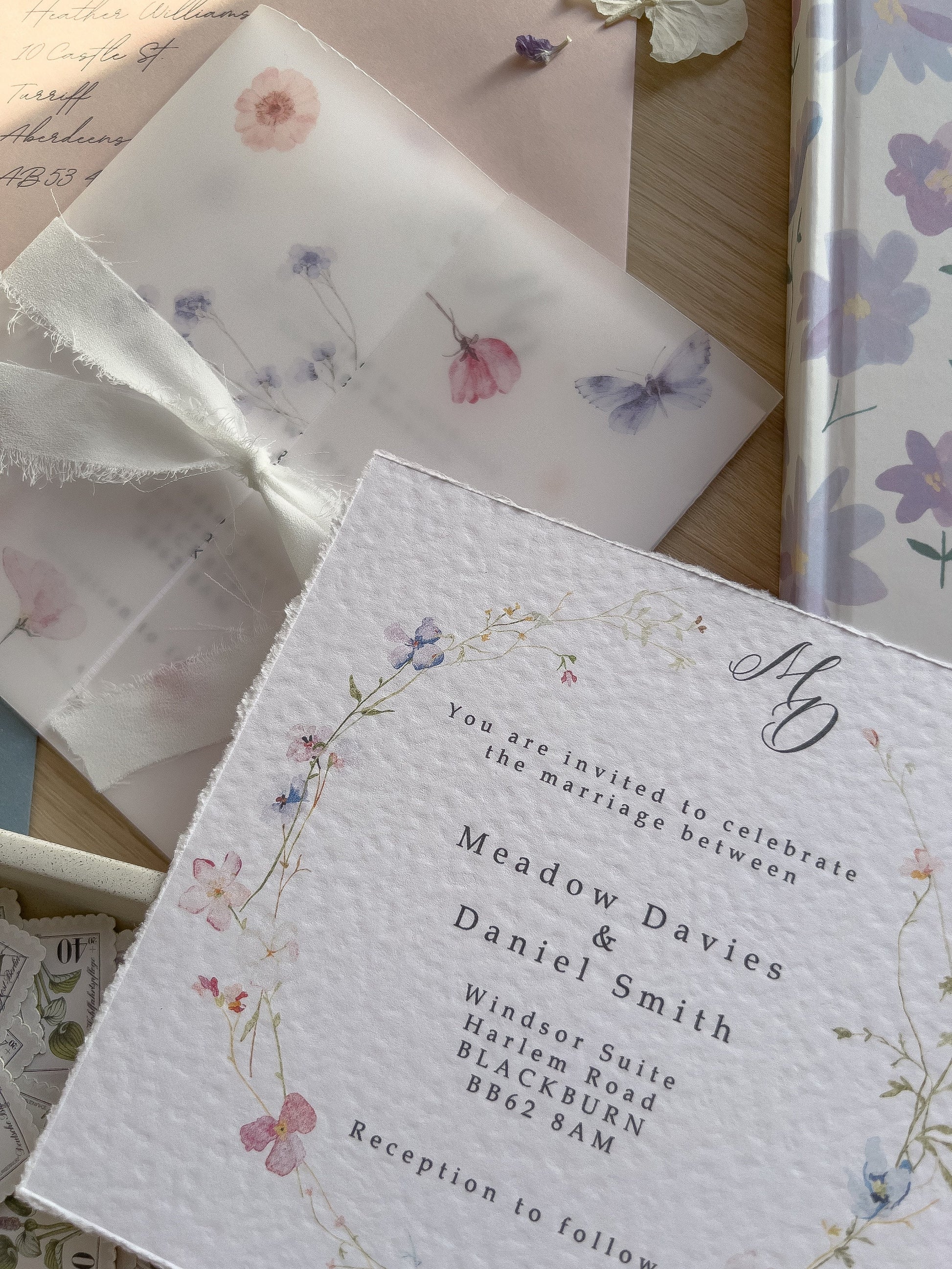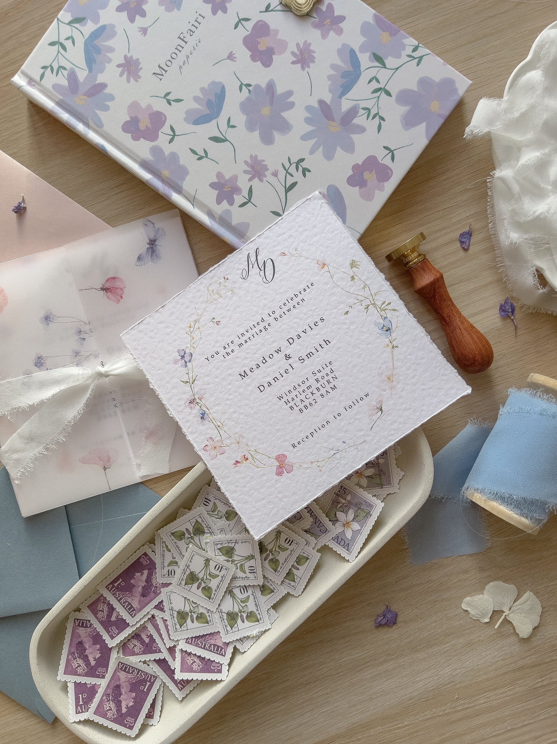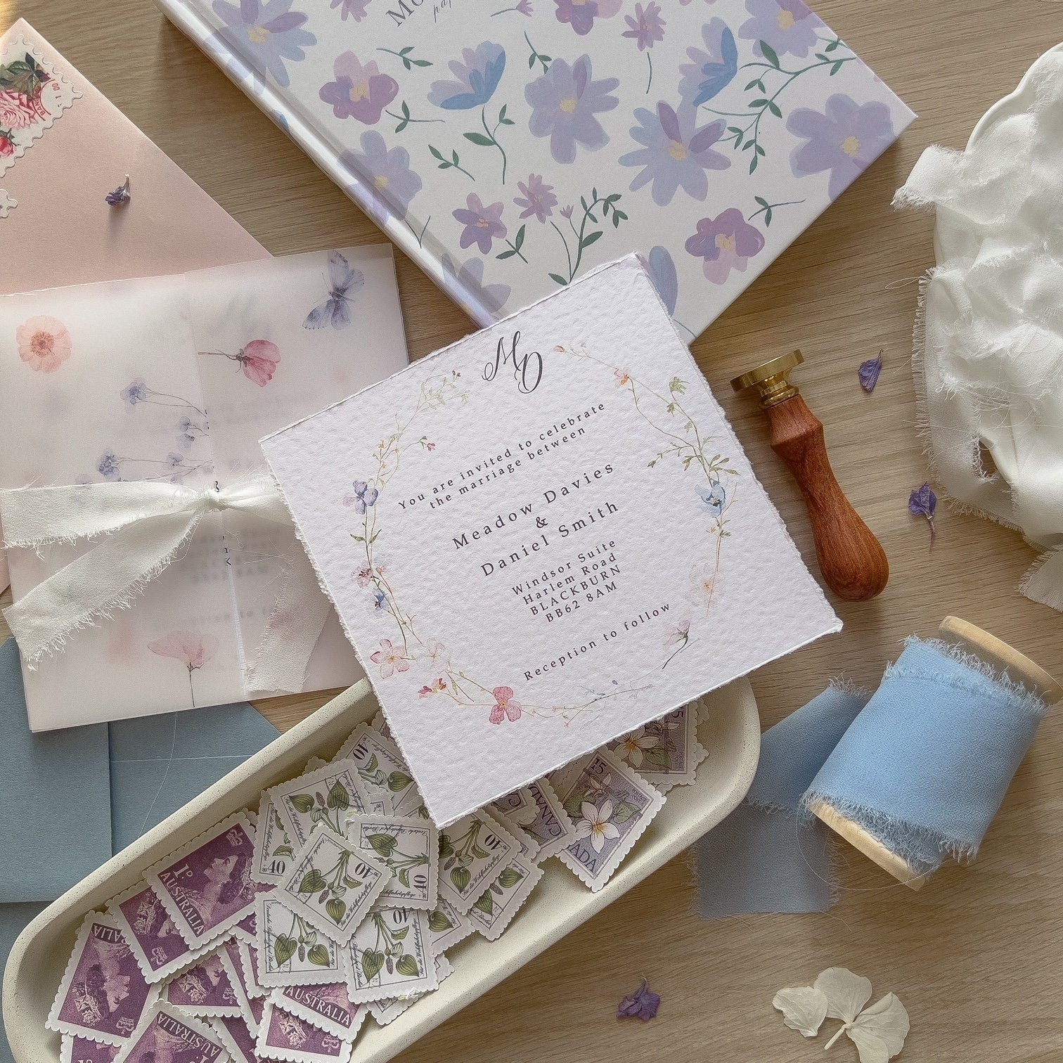 🔑 Keywords: Wedding Invitation Suite, Watercolour Flowers, Hammered Cardstock, Deckled Edge, Square Wedding Invitations, Elegant Wedding Stationery.