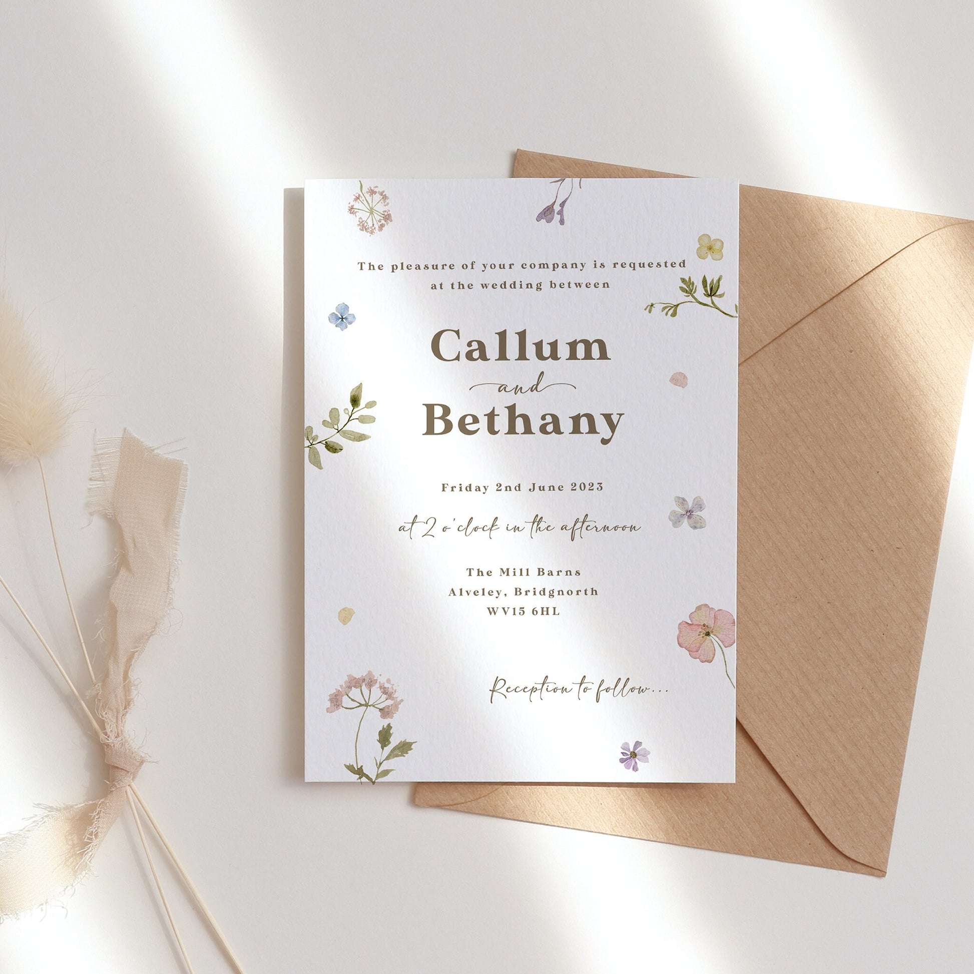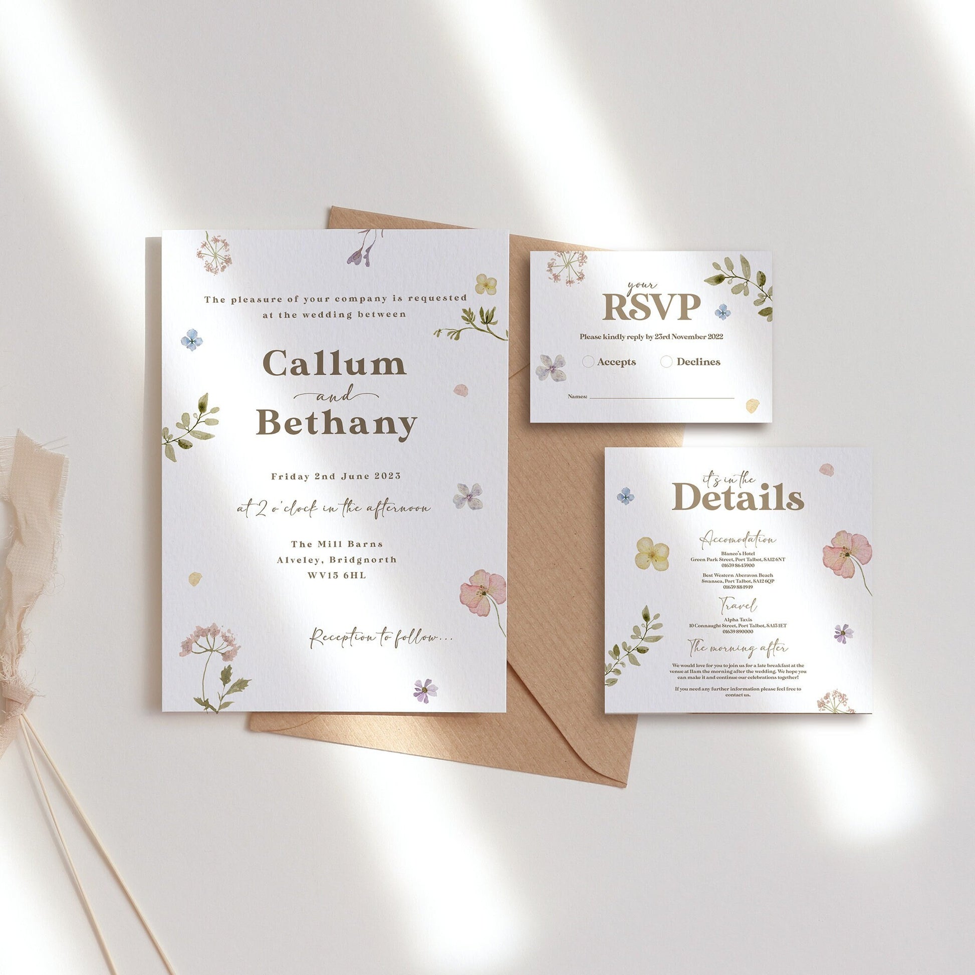Featuring muted pastel-coloured pressed flowers on 260gsm hammered cardstock. Embrace the timeless allure of the Primrose Collection and create a cohesive and magical experience for your guests. From the invitations to the place cards, let the delicate beauty of pressed flowers captivate all who are fortunate to be part of your celebration.