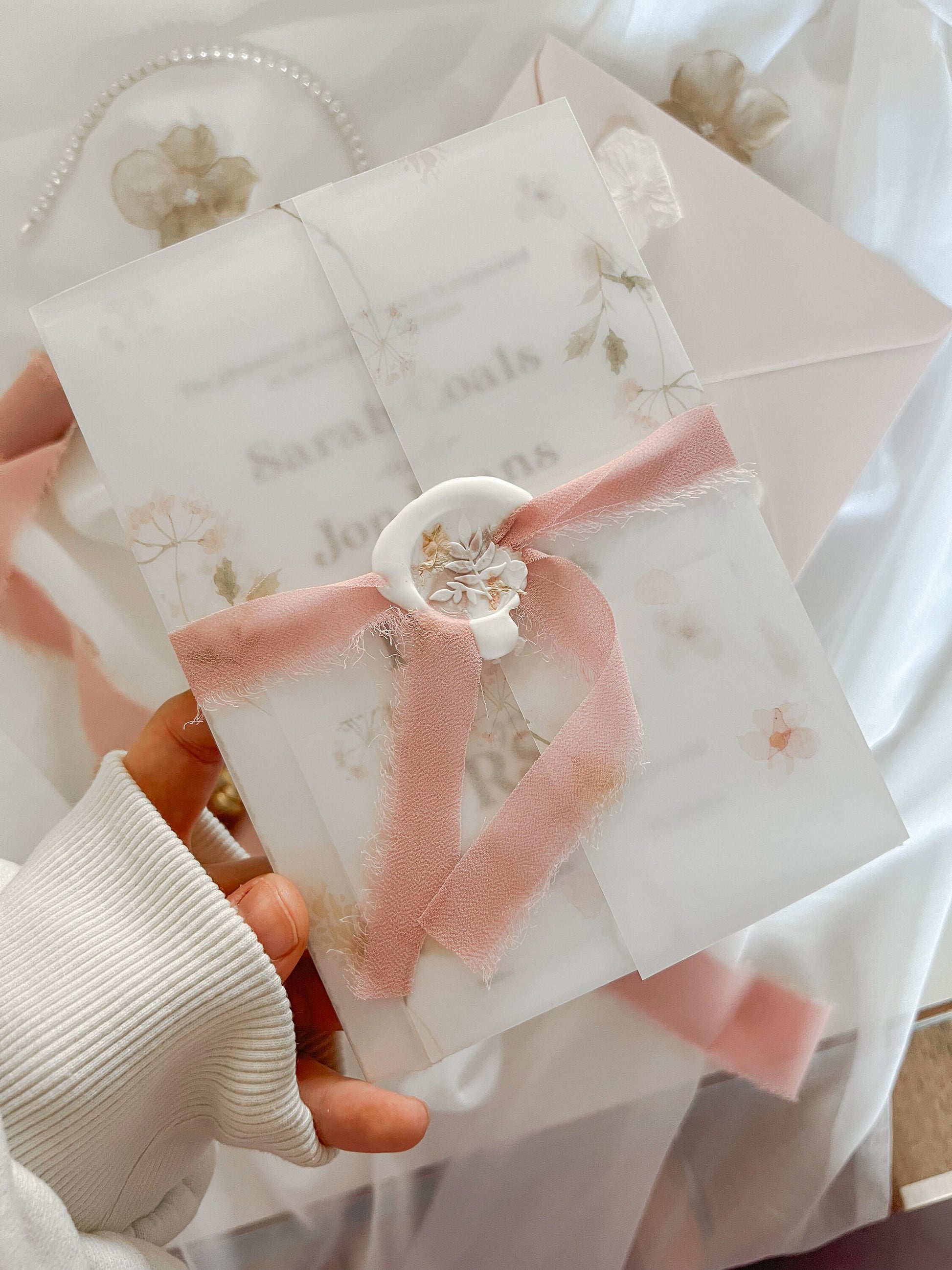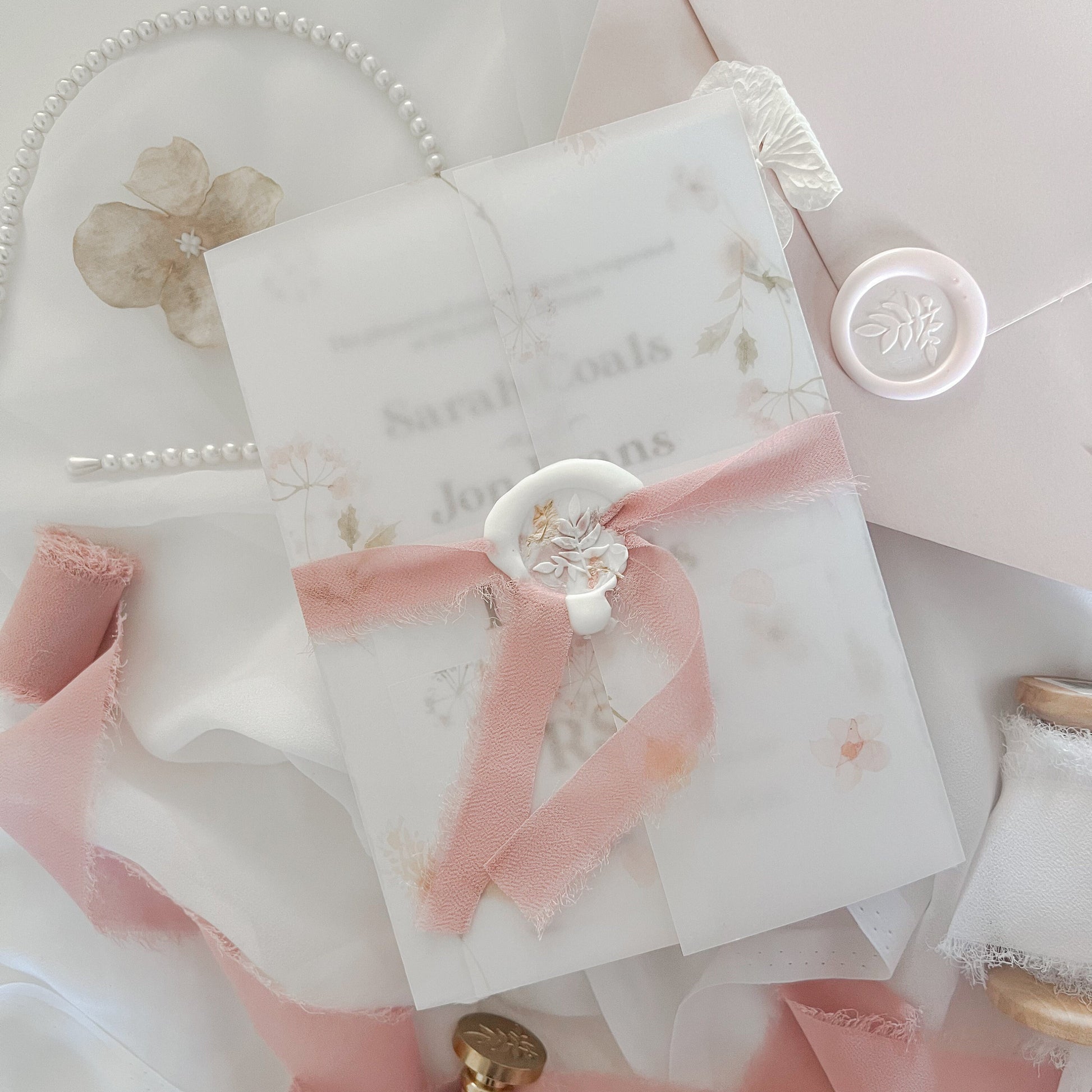 Every stationery piece is carefully crafted and finished for an impressive look. Our Vellum is thick and sturdy yet lightweight, providing a luxurious feel. Decorated with beautiful watercolour florals and pampass, is an elegant way to upgrade your invitations. Perfectly pairs with a chiffon ribbon and wax seal.