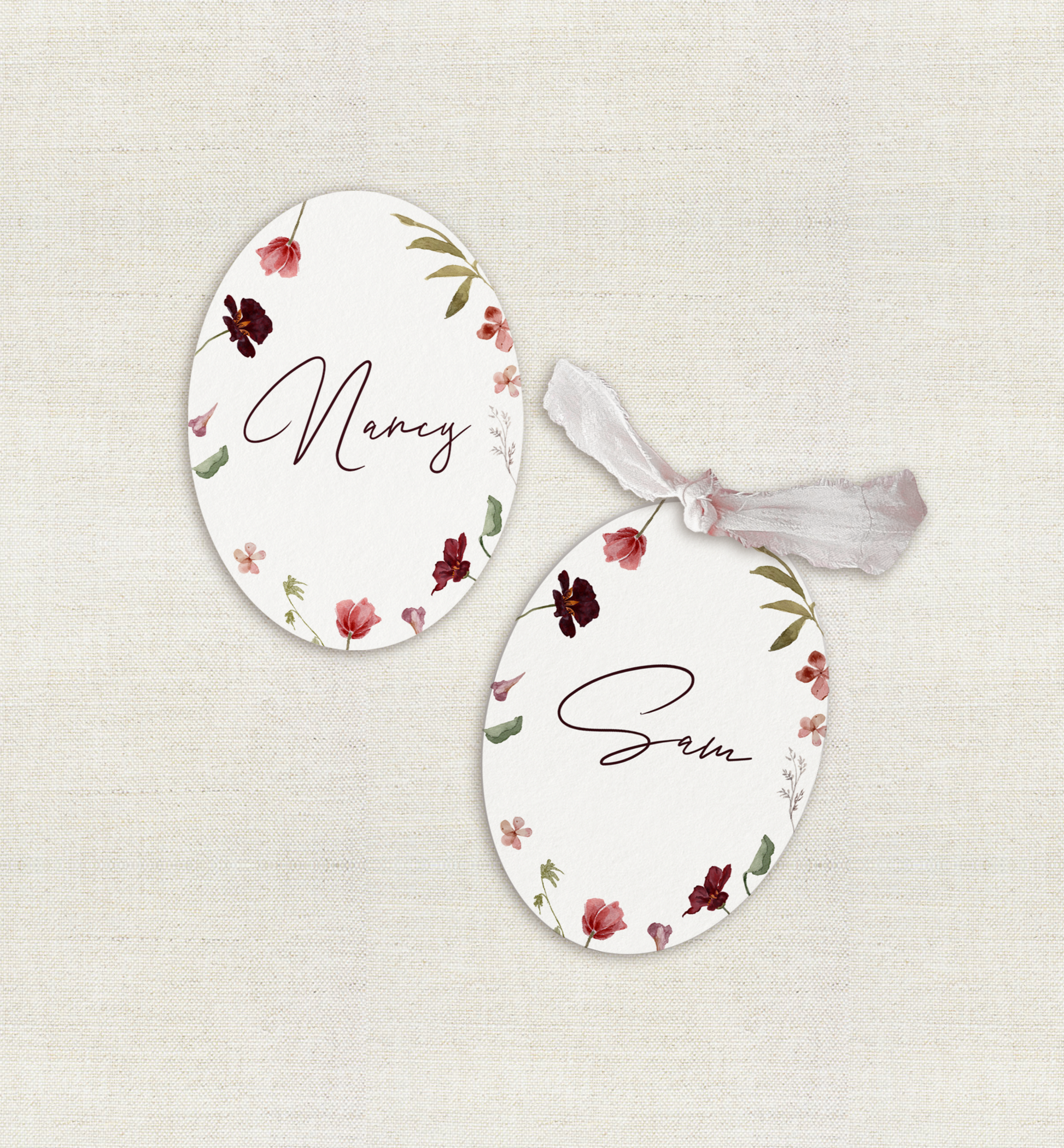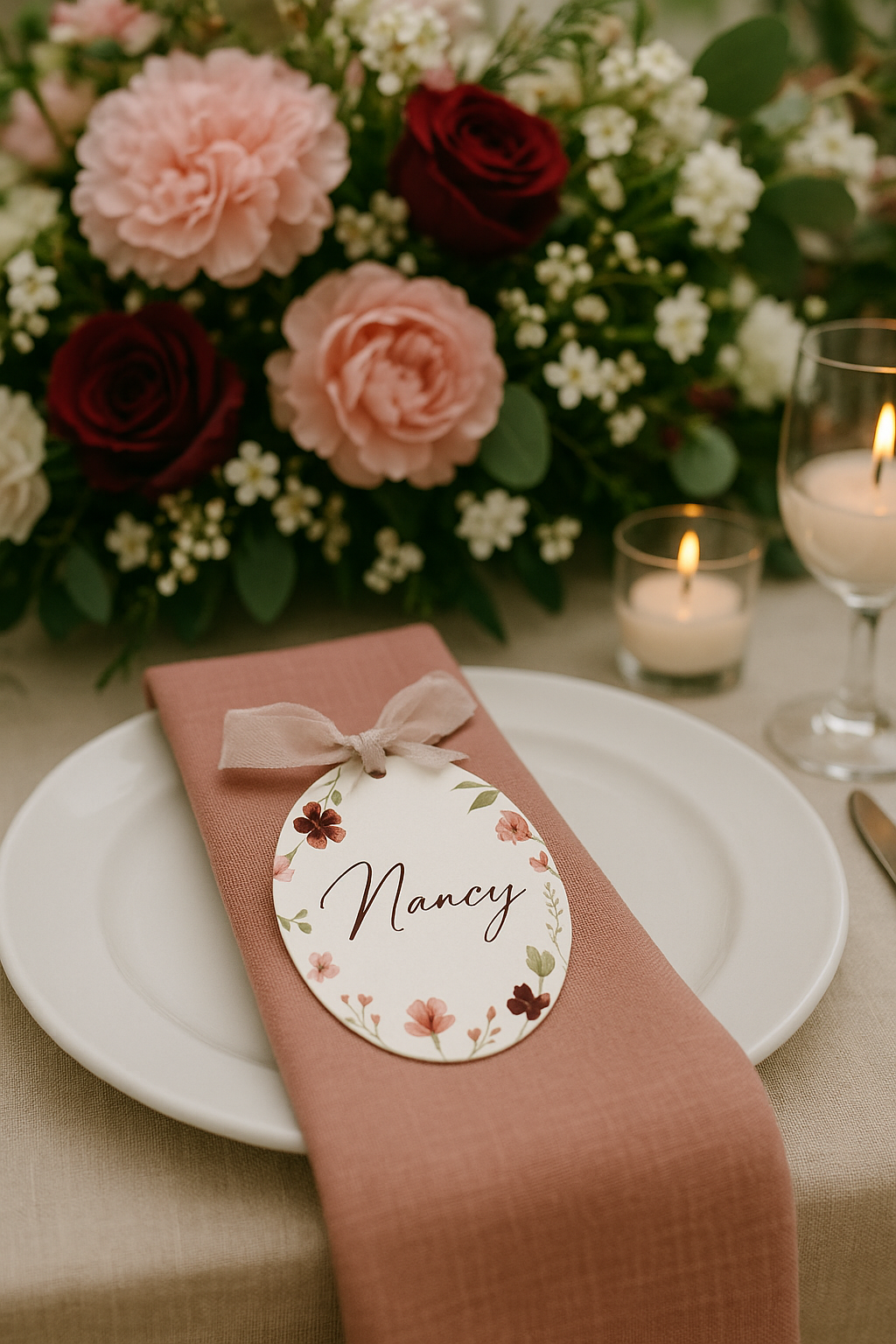 Indulge in culinary delights with the Rosedew Name cards. This exquisite piece from the Rosedew Collection showcases different shades of pink florals and vintage-inspired details. Elevate your reception with its elegant design, ensuring a memorable dining experience for your guests.