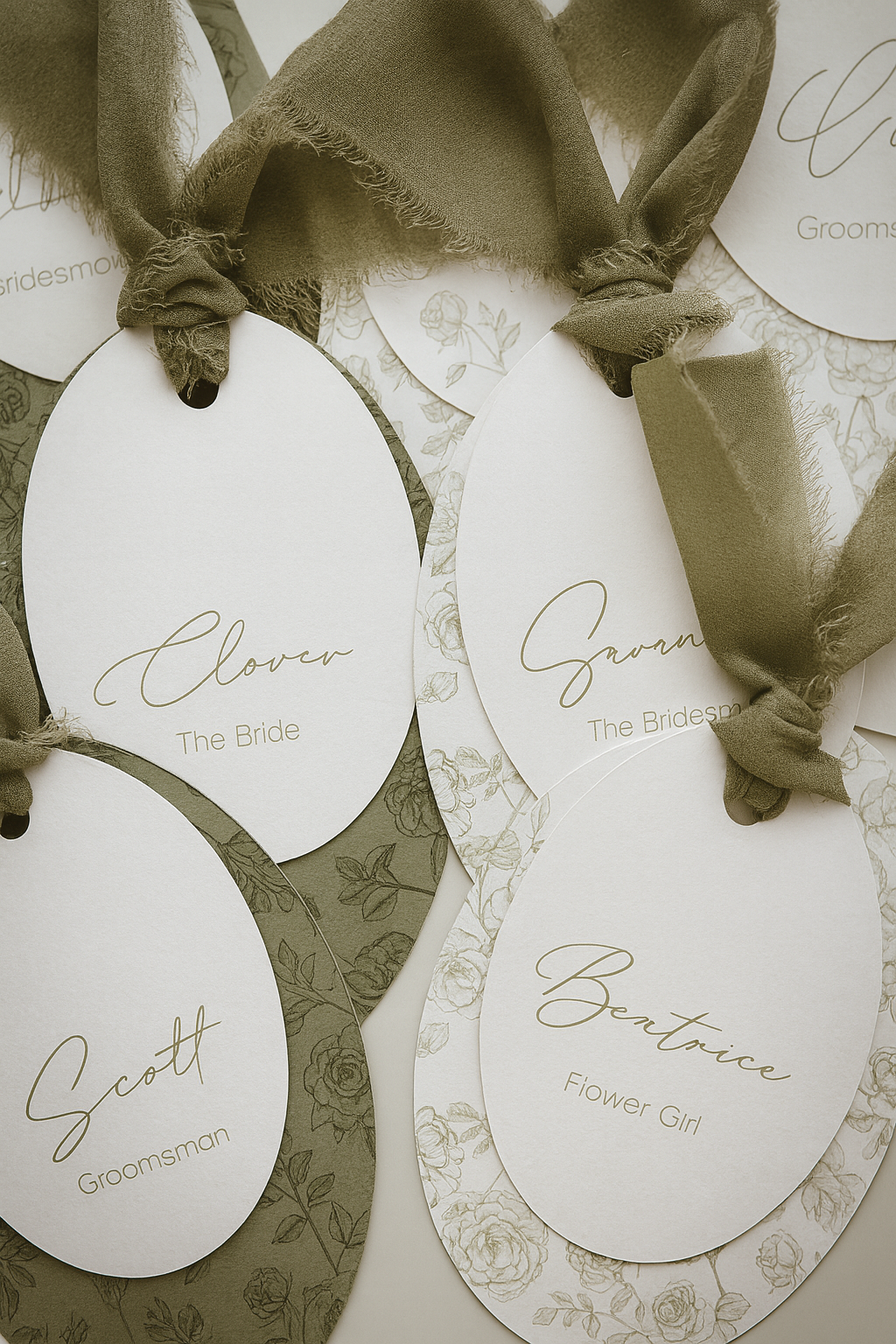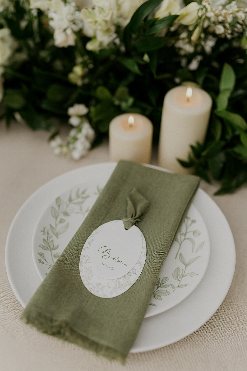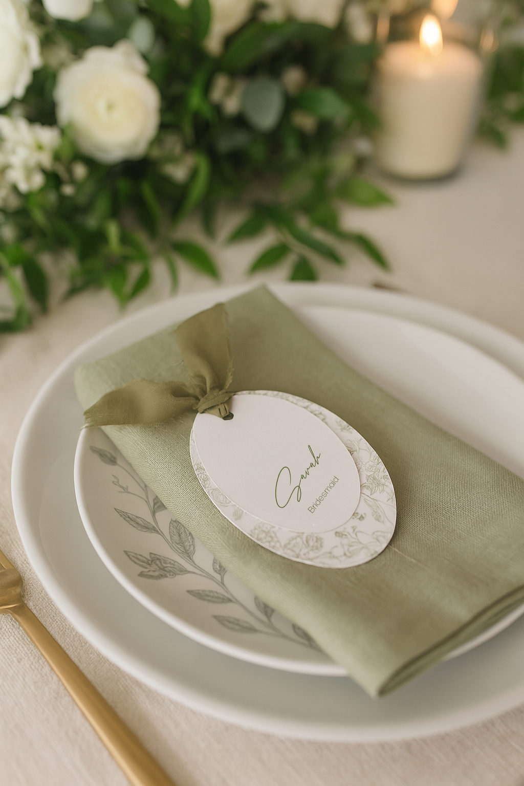 These stunning green botanical toile place cards are perfect for that sage themed or destination wedding. Adding a stunning elegant touch to your tables, allowing your guests know exactly where they are seated, while also providing a beautiful keepsake for each guest to take home at the end of the day.