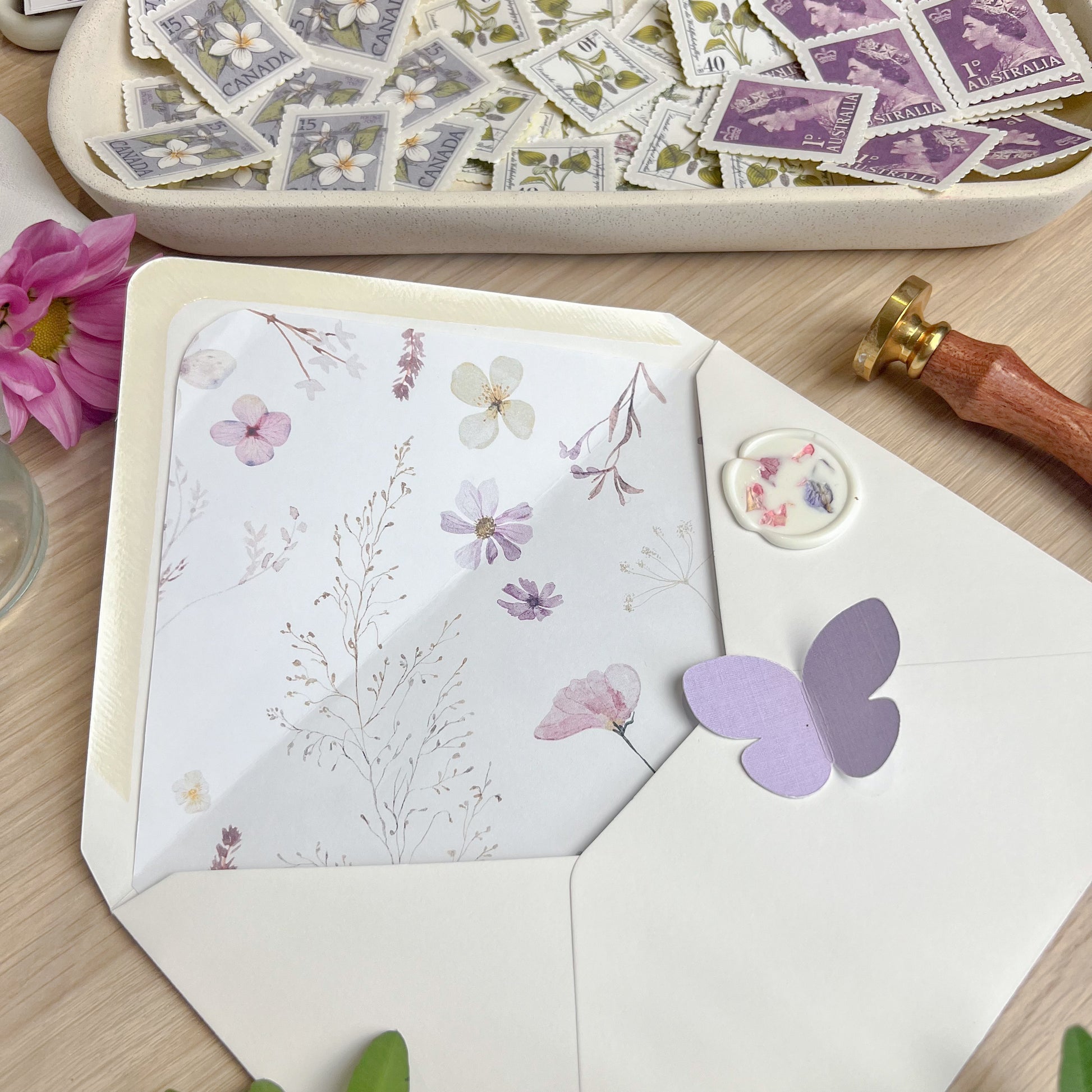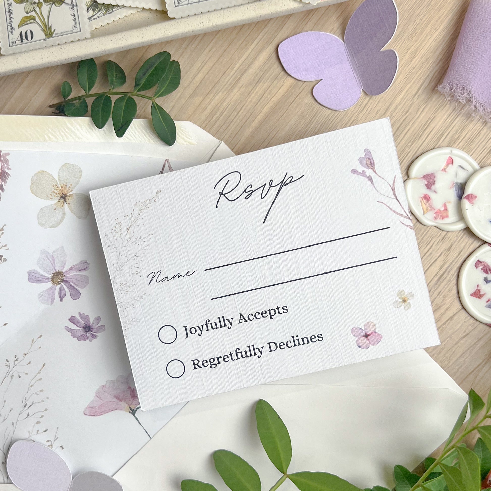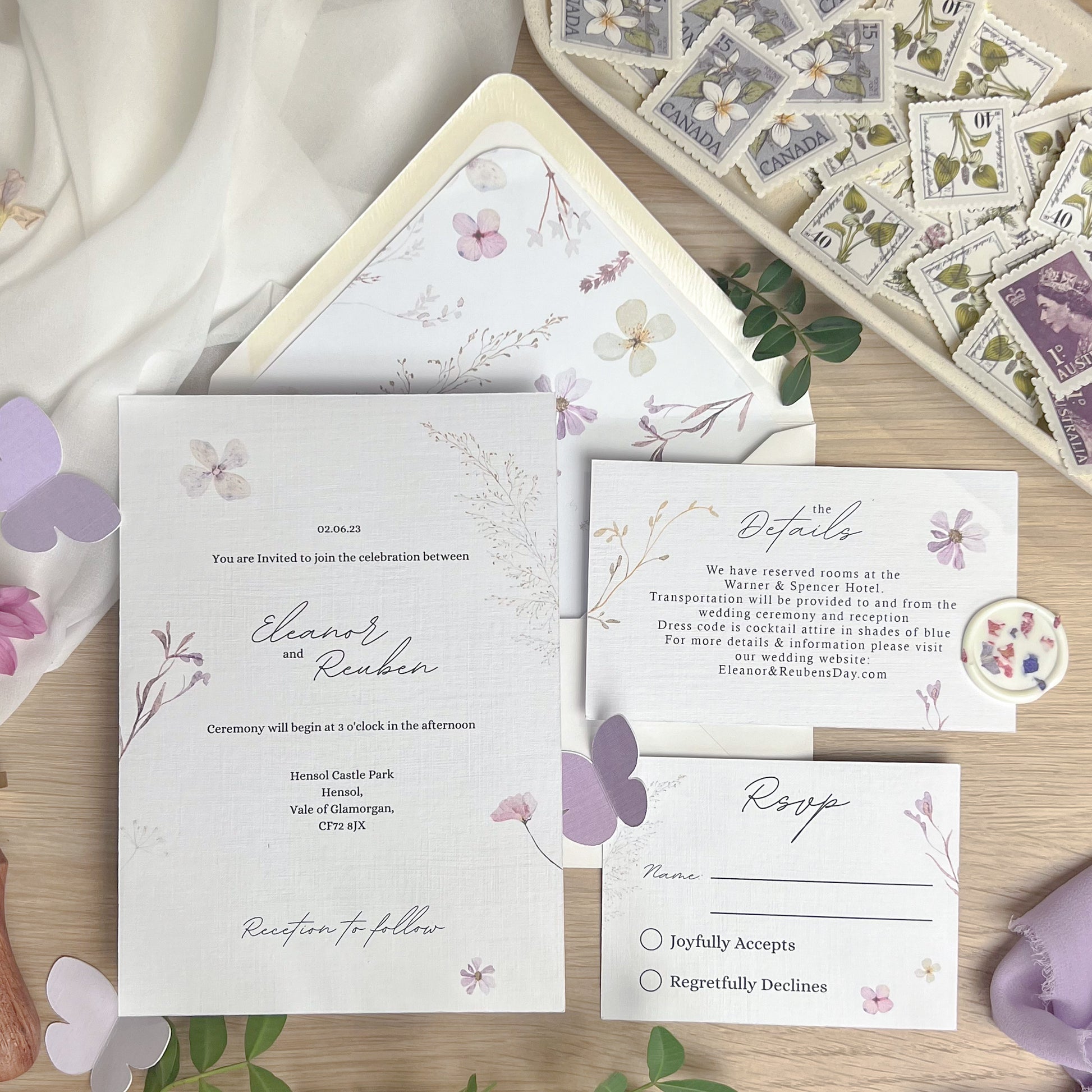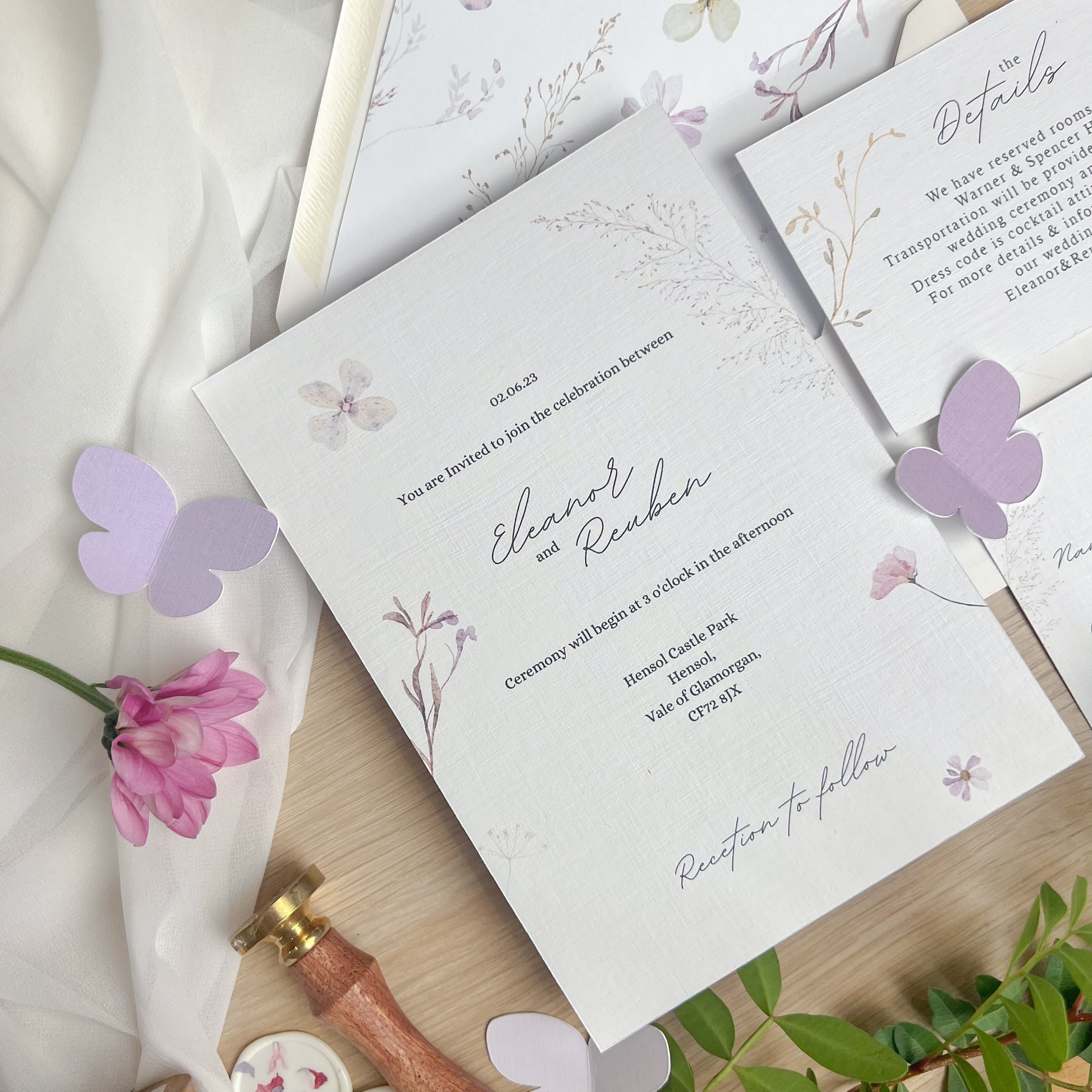 Introducing 'The Eleanor' sample pack, a whimsical wedding invitation set that includes an envelope, 5x7 inch invitation, rsvp and details card. Each beautifully printed on 300gsm linen cardstock, adorned with charming purple florals and butterflies. Make your special day even more magical with this unique design.