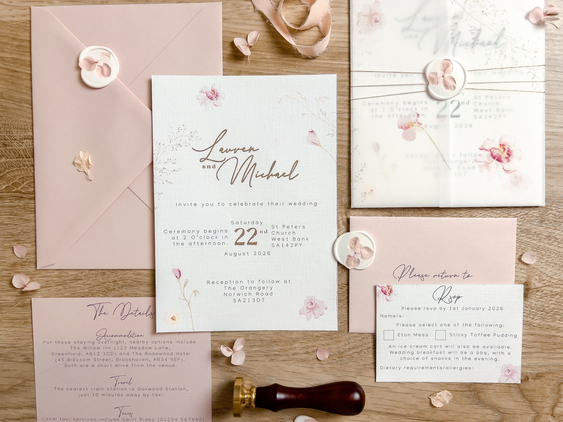 Introducing the Lauren Wedding Invitation, a captivating blend of softness, romance, and delicate details. Designed with utmost care and infused with a touch of enchantment, this invitation from the Lauren Collection by Moonfairi sets the stage for a truly unforgettable celebration.