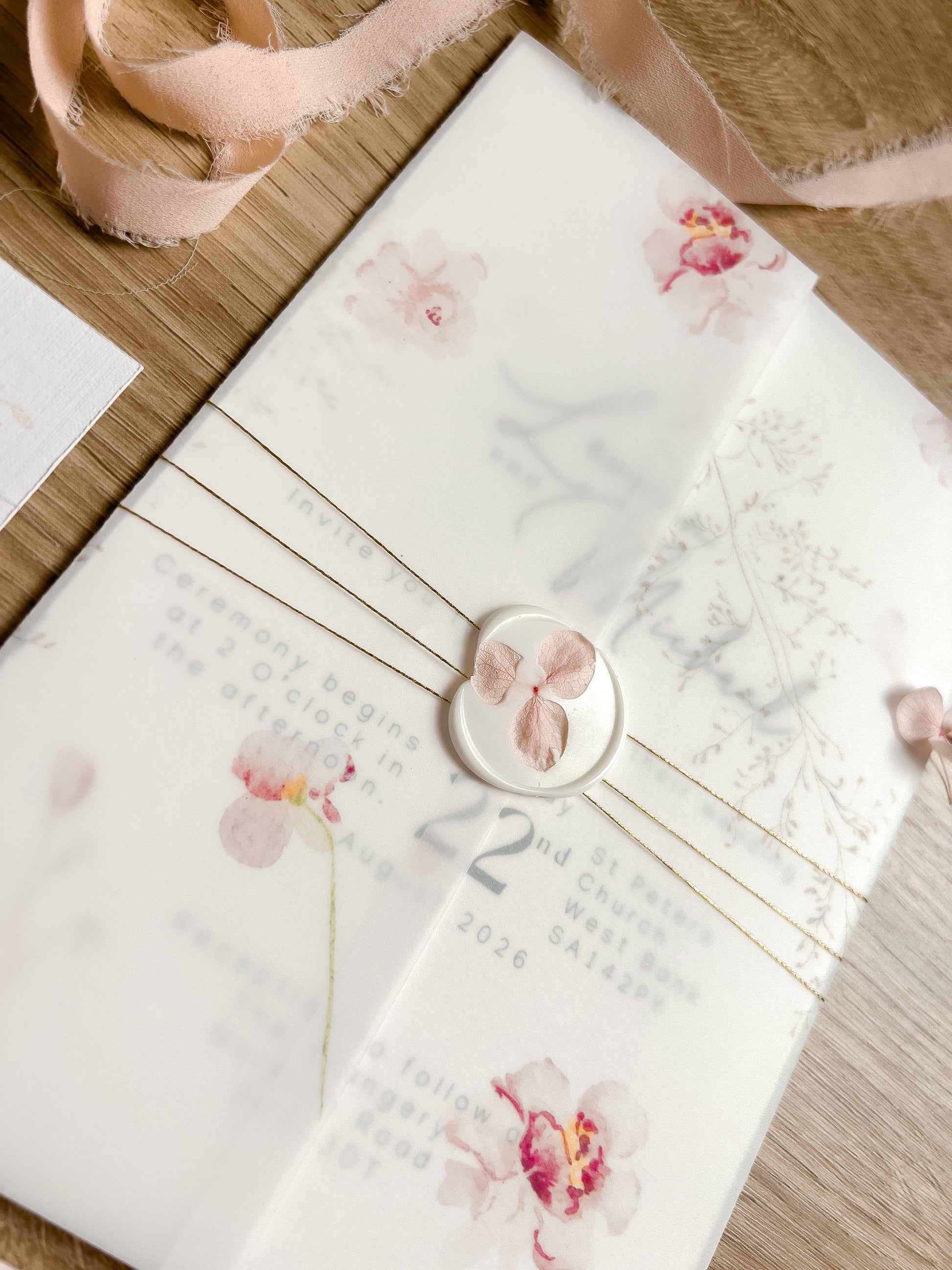 -Invitation, details card and rsvp -Envelopes - Vellum jacket and Wax Seal