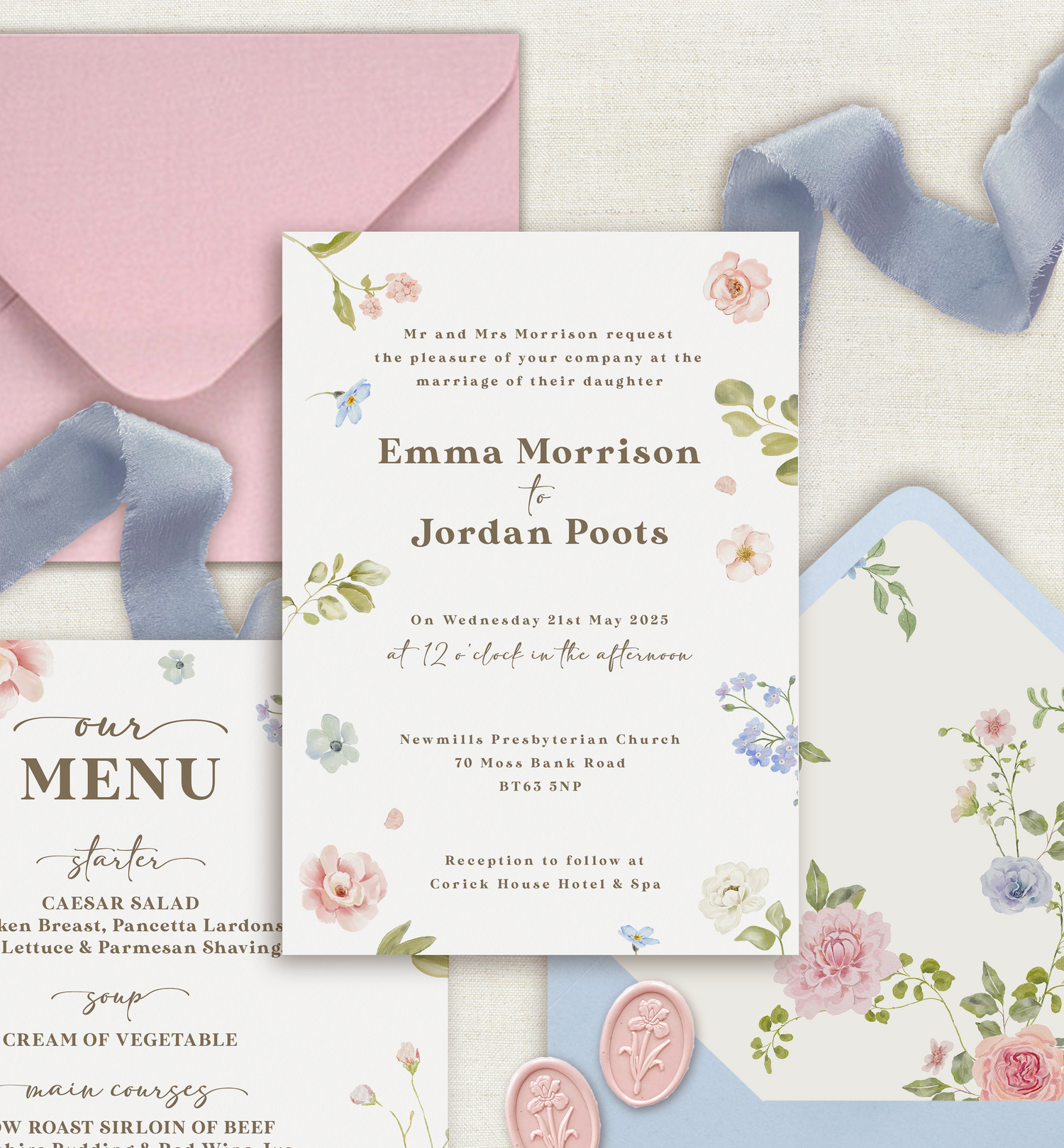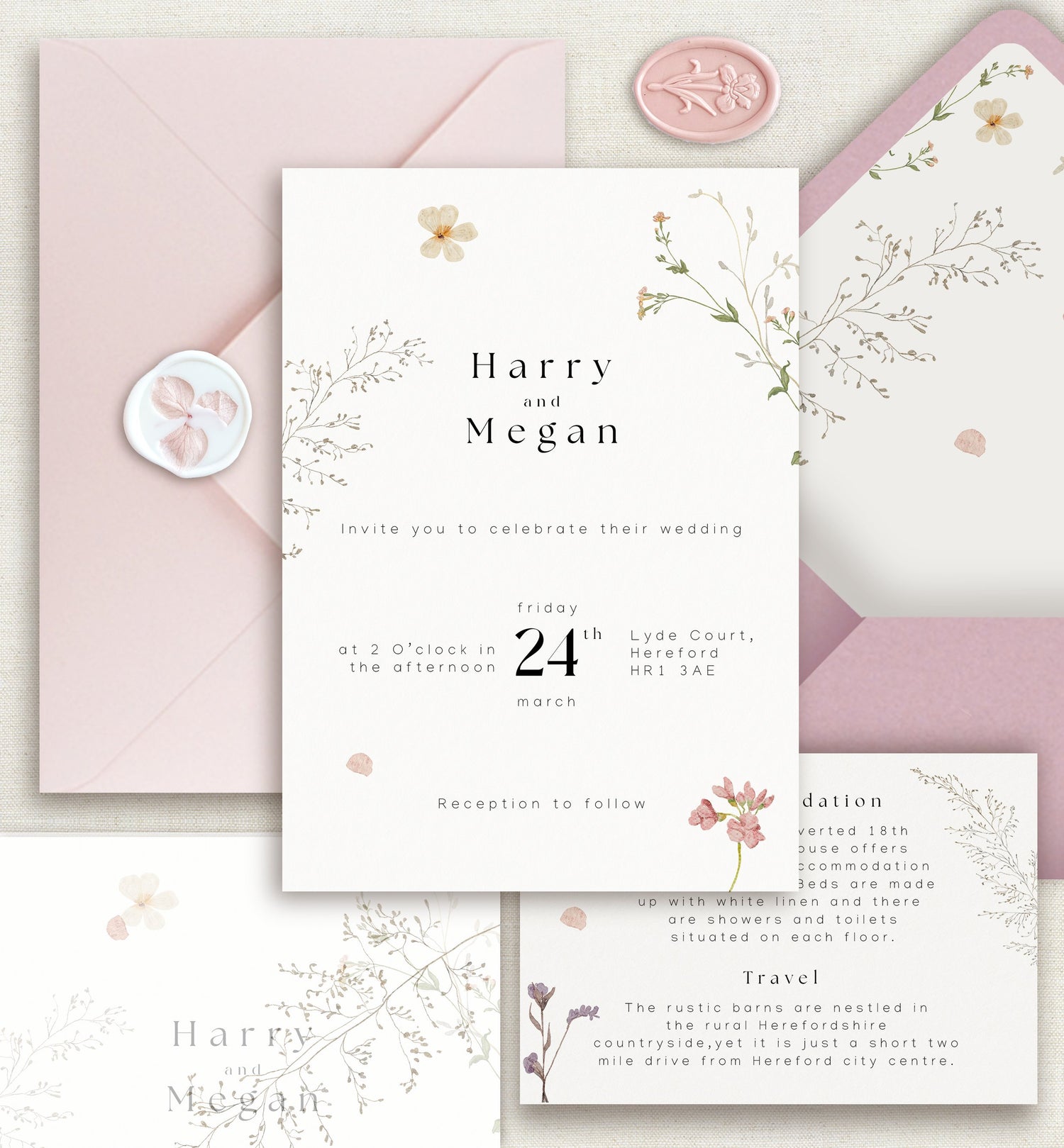 Soft wildflower inspired wedding invitations and on the day stationery, made in a little countryside studio in Hampshire, United Kingdom; delivering globally.